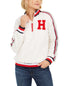 Tommy Hilfiger Women's Stripped Trim Printed Long Sleeve Zip Neck Sweater White Size Large