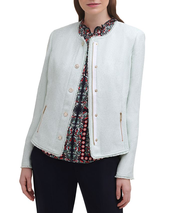 Shiny zips| signature snaps and frayed edging totally update the professional shape of this textured jacket from Tommy Hilfiger.| Approx. 21-1/2 long | Round neckline; zipper and snap closure at front| Frayed edging at neckline| center front