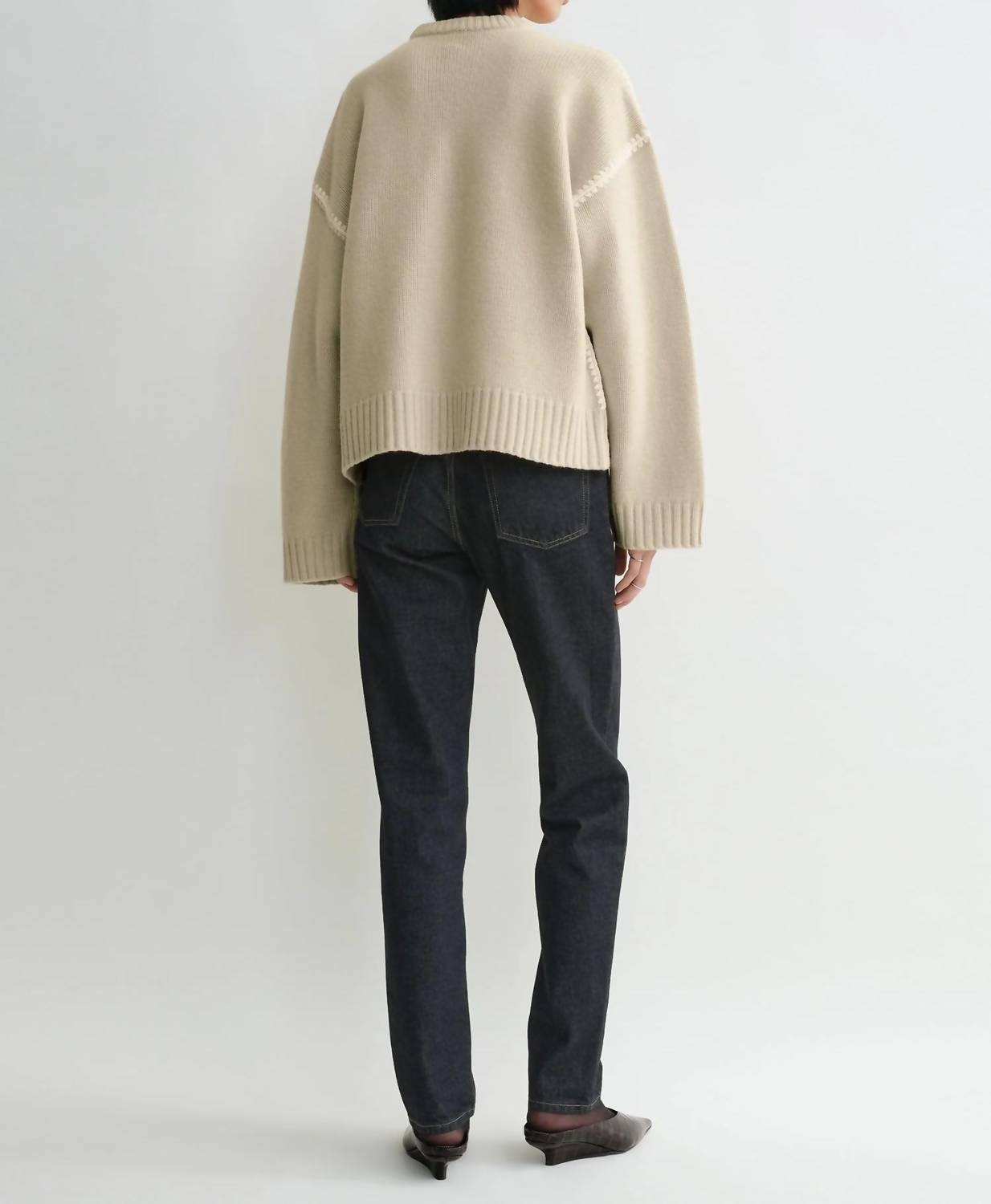 Stay warm and stylish in this versatile and effortlessly cool knitwear staple. Wear it alone or layered, it's the perfect sweater for the season and you'll wish you had it in every color. Introducing the TOTEME Embroidered Wool Cashmere Knit Sweater, an oversized delight in elegant beige. This women's long sleeve piece combines the softness of 90% wool and 10% cashmere with intricate embroidered knit details. Featuring a crewneck and ribbed collar, cuffs, and hem, it is embellished with contrasting thread around the shoulders and armholes for a preppy touch. Closure: Pull on. Care: Hand wash and lay flat to dry. Perfect for travel during the spring season.