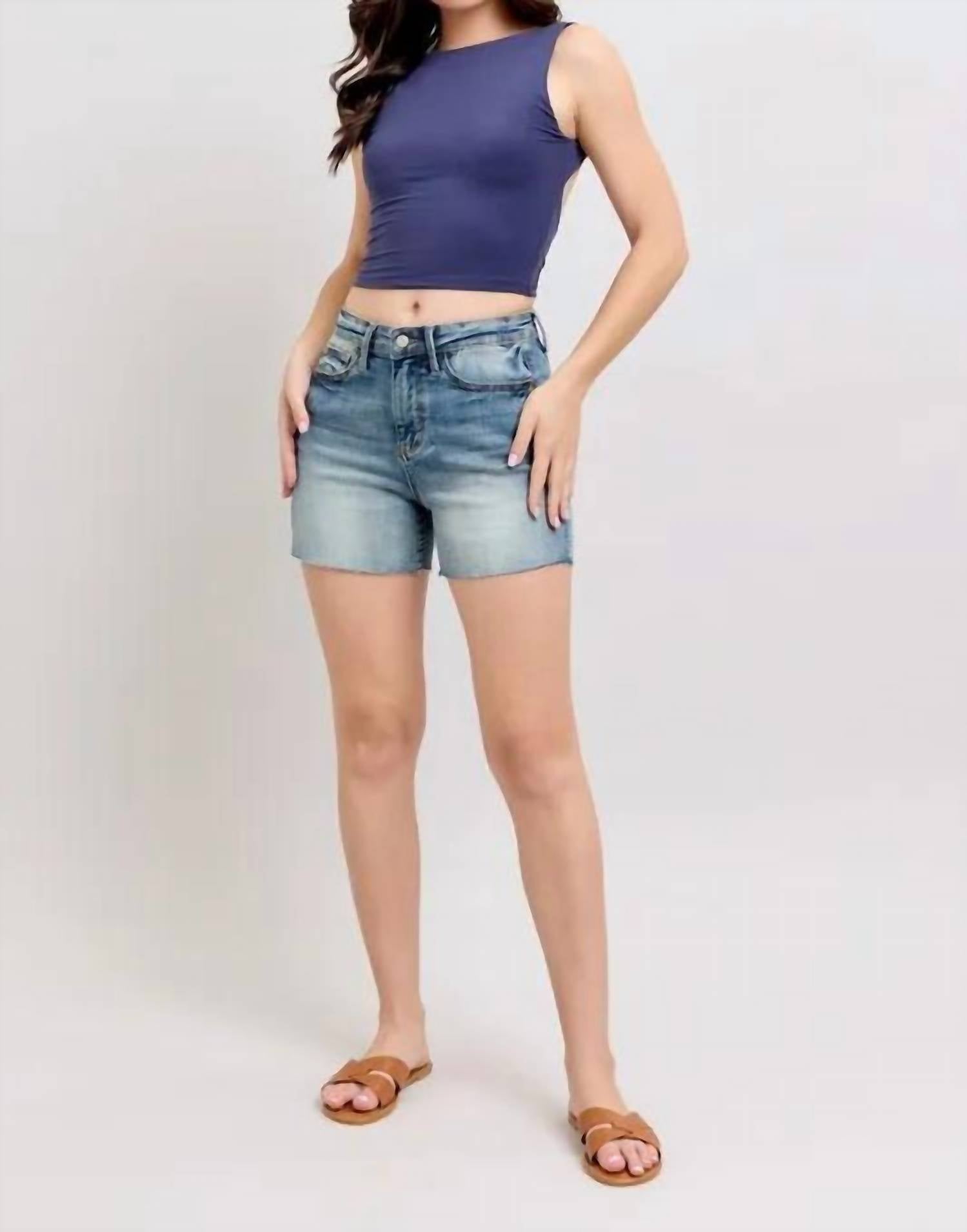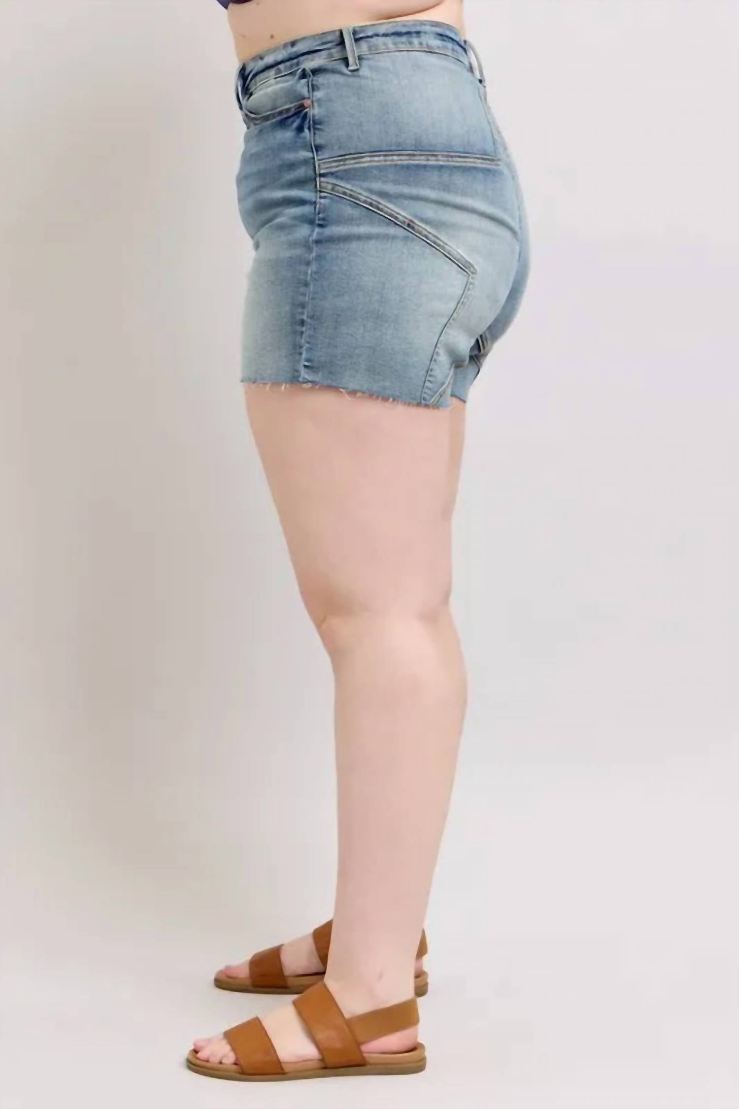 Tuck your favorite tee into these high-waist shorts for a more casual-cool feel. Elevate your summer wardrobe with the Judy Blue High Waist Star Seam Detail Denim Shorts by Trendsi, designed for style and comfort. These women's shorts feature a flattering high-rise design with star-shaped seam detailing, crafted from a cotton blend (91% Cotton, 7% Polyester, 2% Spandex) for moderate stretch. They are finished with a raw hem and include pockets for convenience. In a versatile medium wash, they come with a button closure and are machine washable with tumble dry recommended, making them perfect for vacations or casual outings. Imported. Available in sizes S to 3XL, with waist measurements ranging from 24 to 36 inches.