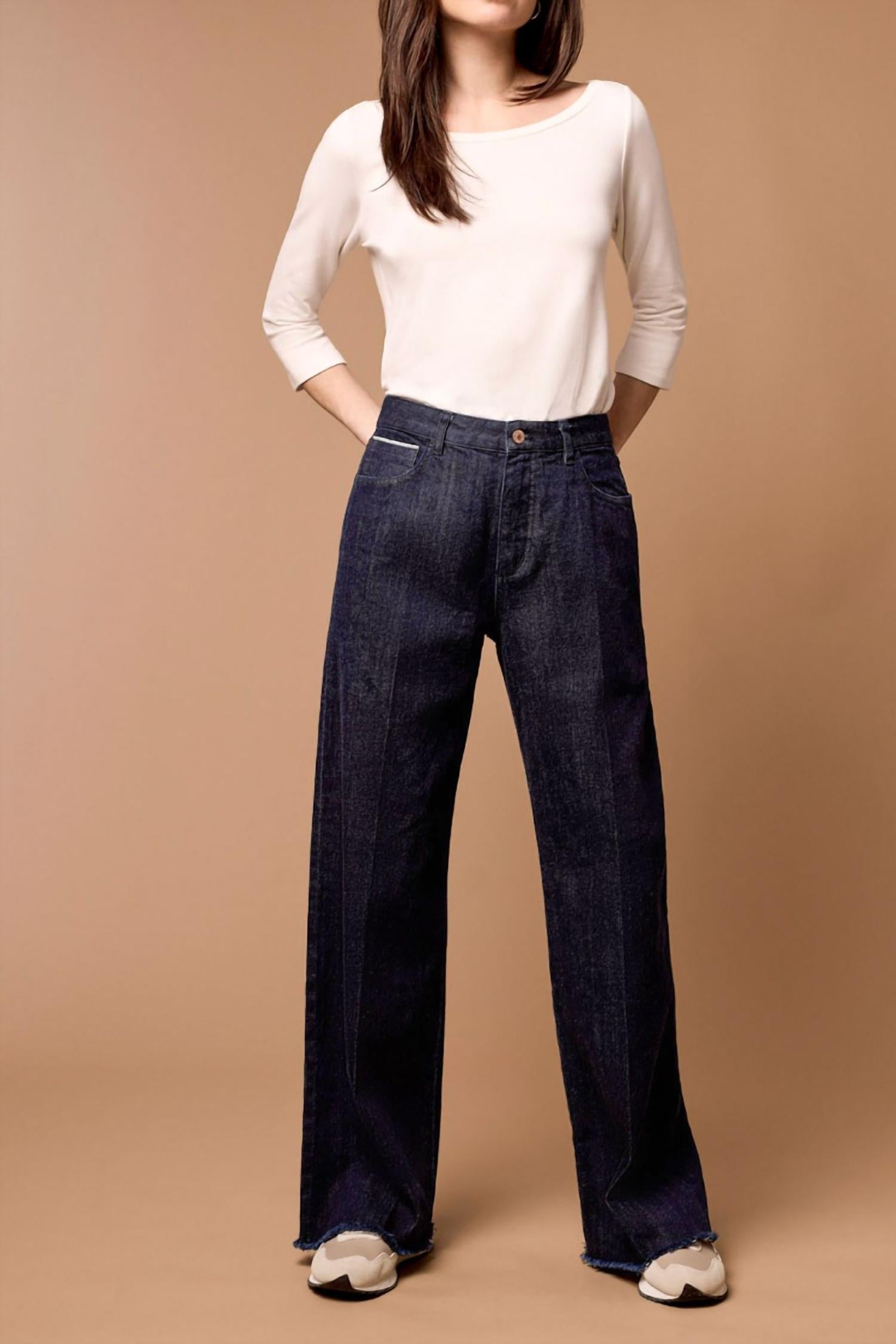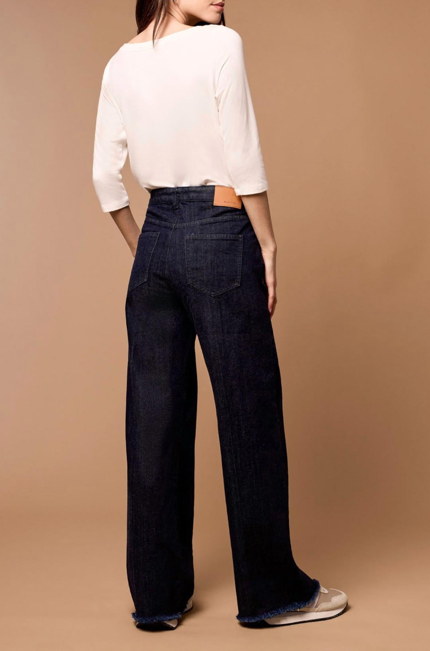 A flattering silhouette that's suprisingly versatile. Introducing the Brooke Hugging Wide Trouser Jean by TRIBAL, a chic choice for a structured yet comfortable look. These dark rinse jeans boast an 11.5" high rise waist and a relaxed fit, complemented by a wide leg style with a 32" inseam and raw hem. Crafted from a 99% cotton and 1% spandex blend, they feature five functional pockets and a button closure for practicality. Care: Machine wash. Ideal for streetwear enthusiasts and perfect for back-to-school or Mother's Day occasions.