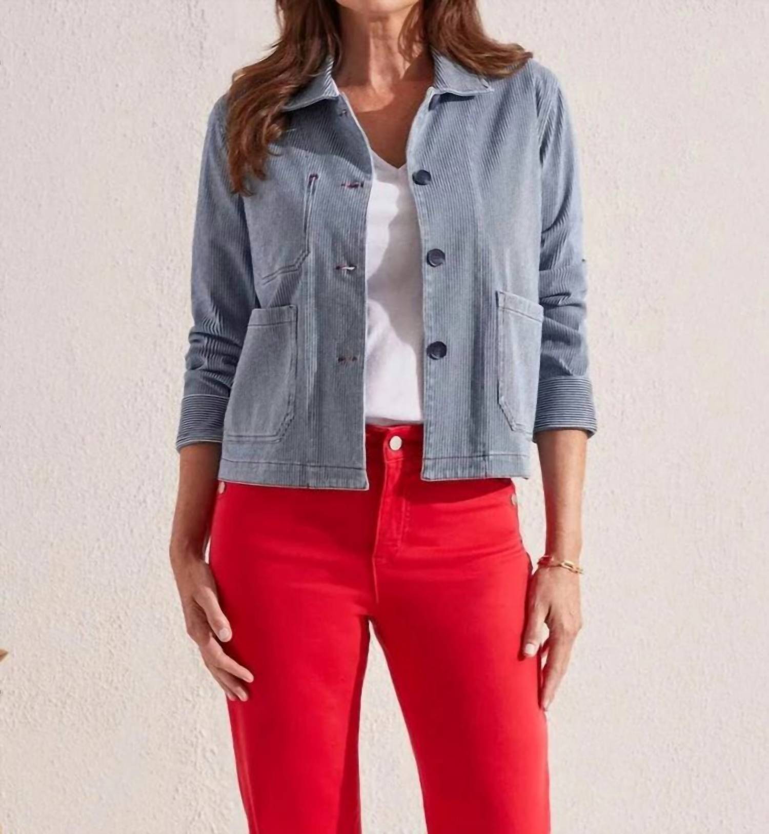 Introducing the Long Sleeve Button Up Jacket by TRIBAL in Jet Blue Stripe, an ideal choice for spring outings. Crafted from Polyester with long sleeves, this casual jacket boasts a relaxed fit and a shirt collar neckline for a refined appearance. The jacket features eye-catching contrast topstitching and marbled buttons, with practical front patch pockets and an inner chest pocket for convenience. This stone-washed yarn dye stripe knit is secured with a button closure, perfect for completing a 90s fashion-inspired vacation look.