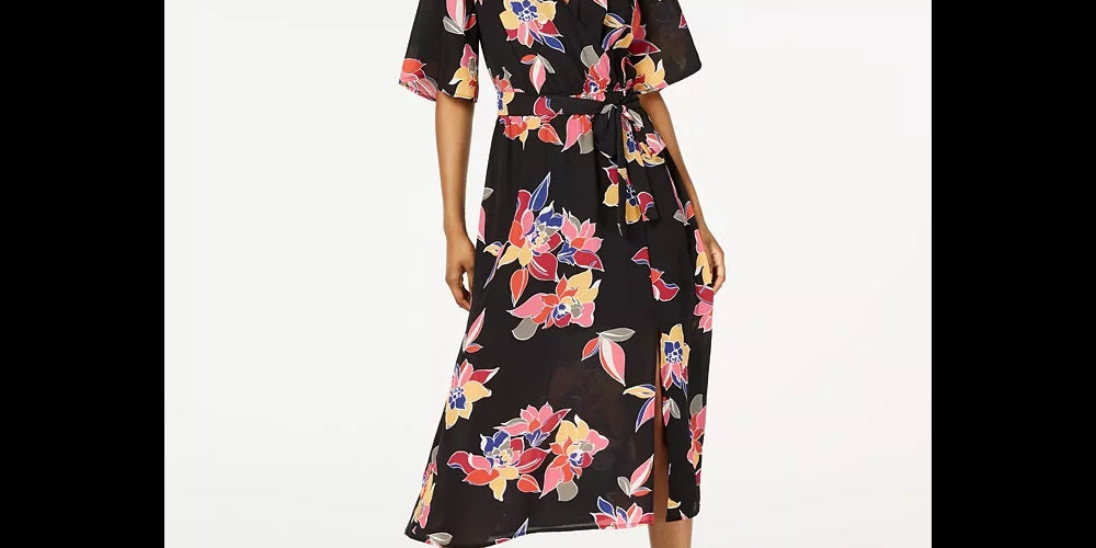 Approx. 47-1/8" long from center back neck to hem. Length is based on size medium and varies 1/2" between sizes|V-neck; Faux-wrap silhouette|Three button closures at back of neck|Removable tie around waist; cutout on back|Polyester|Machine washable
