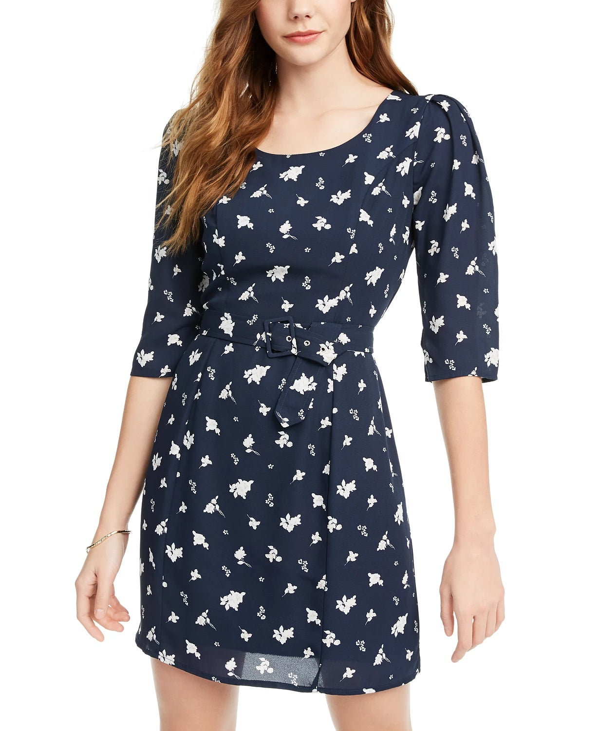 Approx. 32" long from center back neck to hem. Length is based on size medium and varies 1/2" between sizes|Round neckline; A-line silhouette|Back zipper closure|3/4-sleeves|Allover floral print; belt around waist; puff sleeve detail|Polyester/spandex; lining: polyester