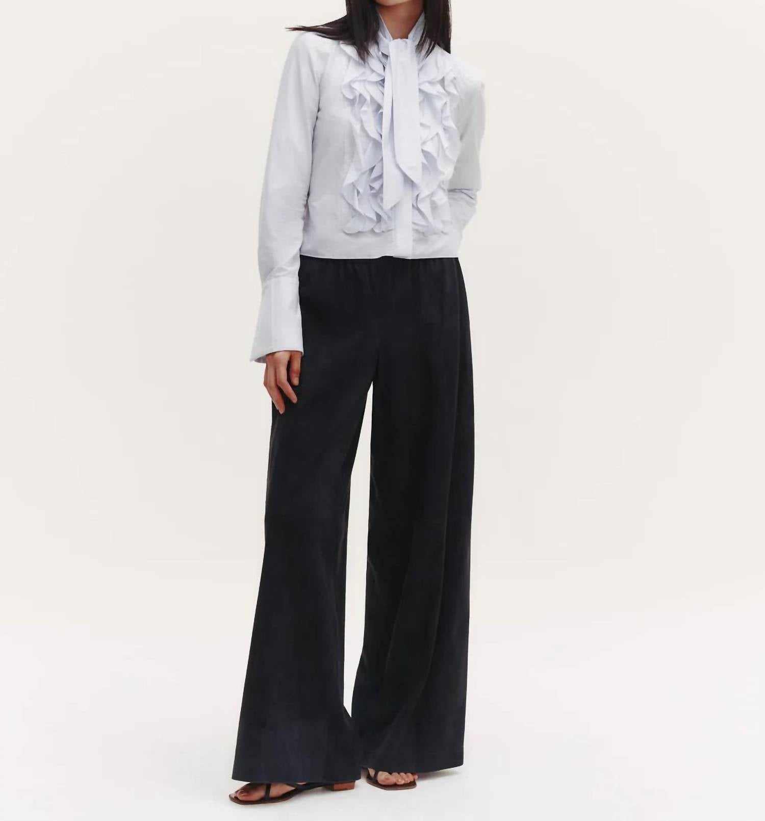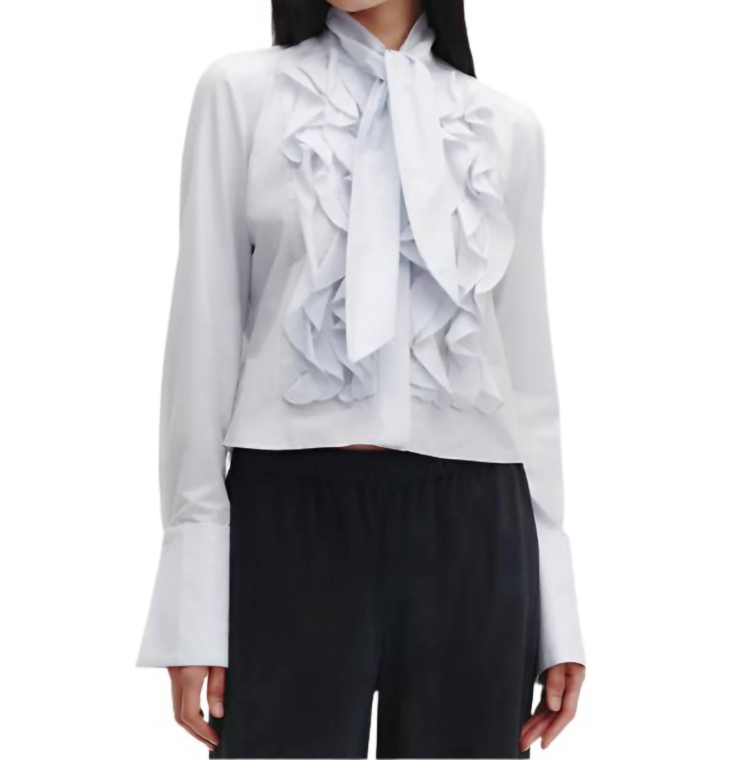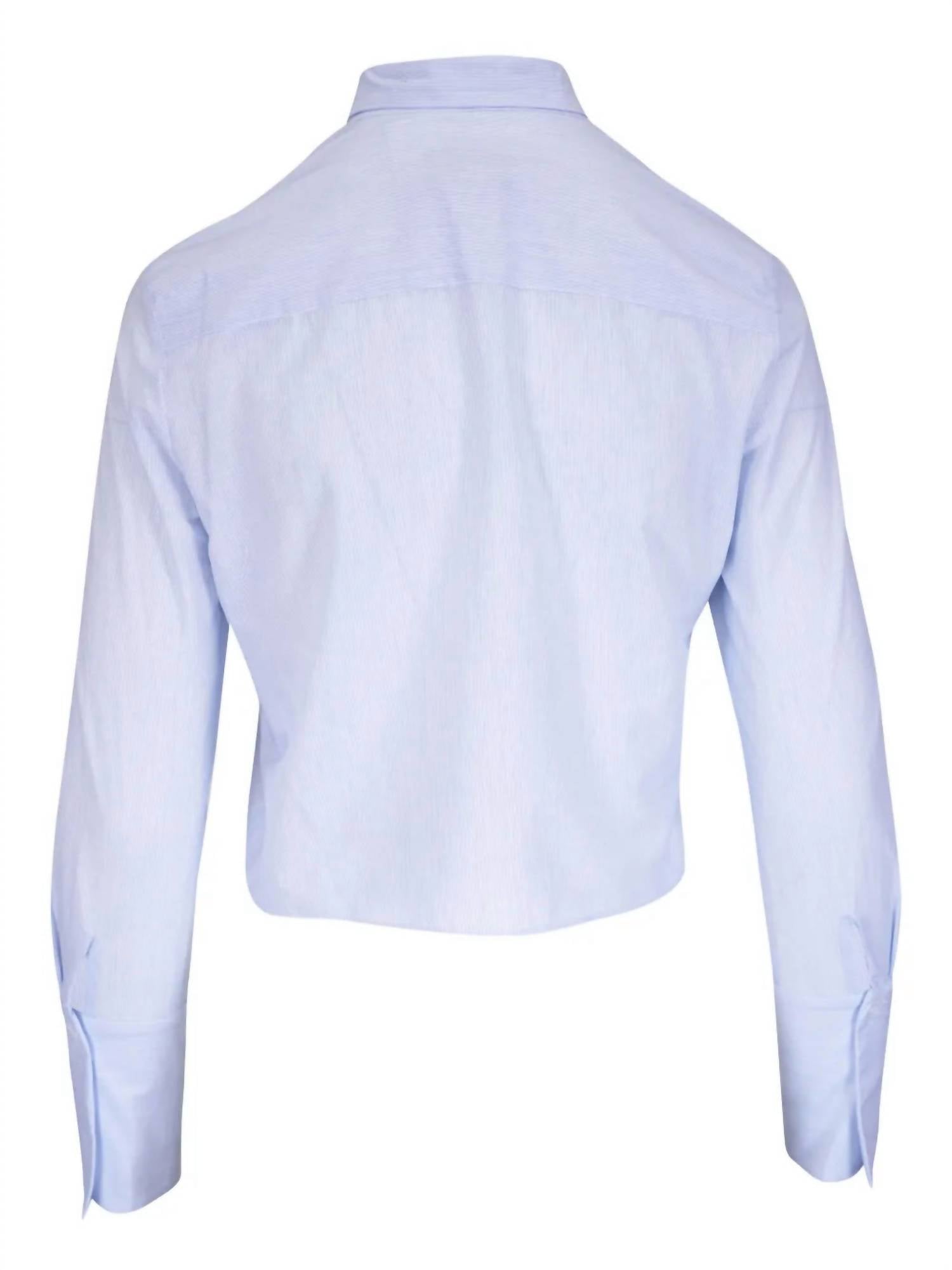 Introducing the Patti Top With Tie by TWP, a chic cropped blouse perfect for any wardrobe. This long sleeve blouse is crafted from a luxurious cotton blend featuring 91% Cotton and 9% Silk, offering a sophisticated stripe pattern. Made in the USA, it boasts a playful mockneck design with a ruffled bib and includes a concealed button closure for a polished finish. Ideal for workwear or vacation, this piece effortlessly combines elegance and style.