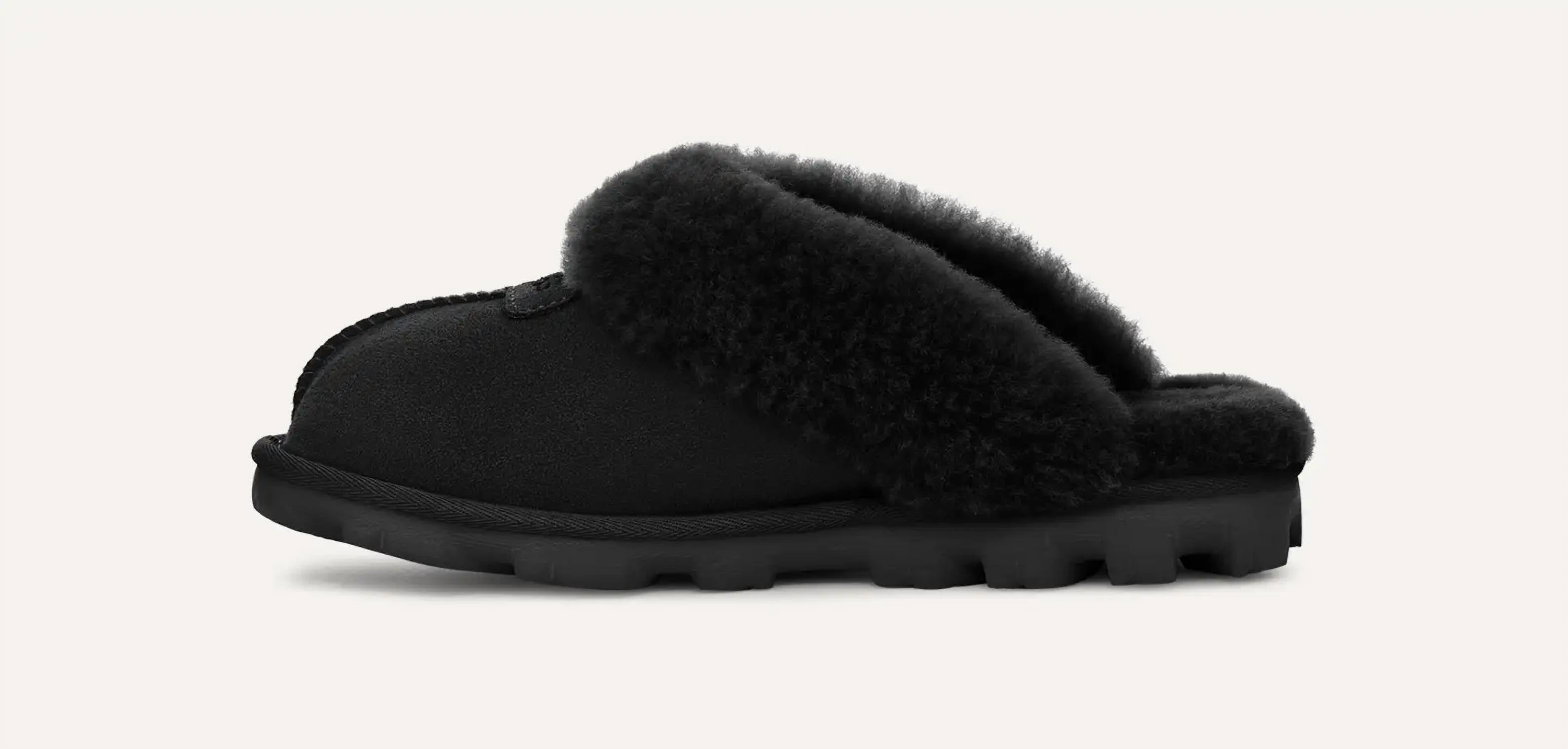 Slip into these, we promise you won't regret it. Experience luxurious comfort with the Coquette Slippers in Black by UGG, ideal for both indoor and outdoor use. Crafted with ultra-soft 17mm Twinface sheepskin upper and insole, these slippers ensure a stay-dry, temperature-controlled environment. The Treadlite by UGG™ outsole provides superior comfort and extra tread for traction, complemented by polyester or recycled polyester textile binding. Featuring a stylish suede label embossed with the UGG® logo, these slippers offer a divine feel for those special vacation days or simply enjoying a tranquil Father's Day.