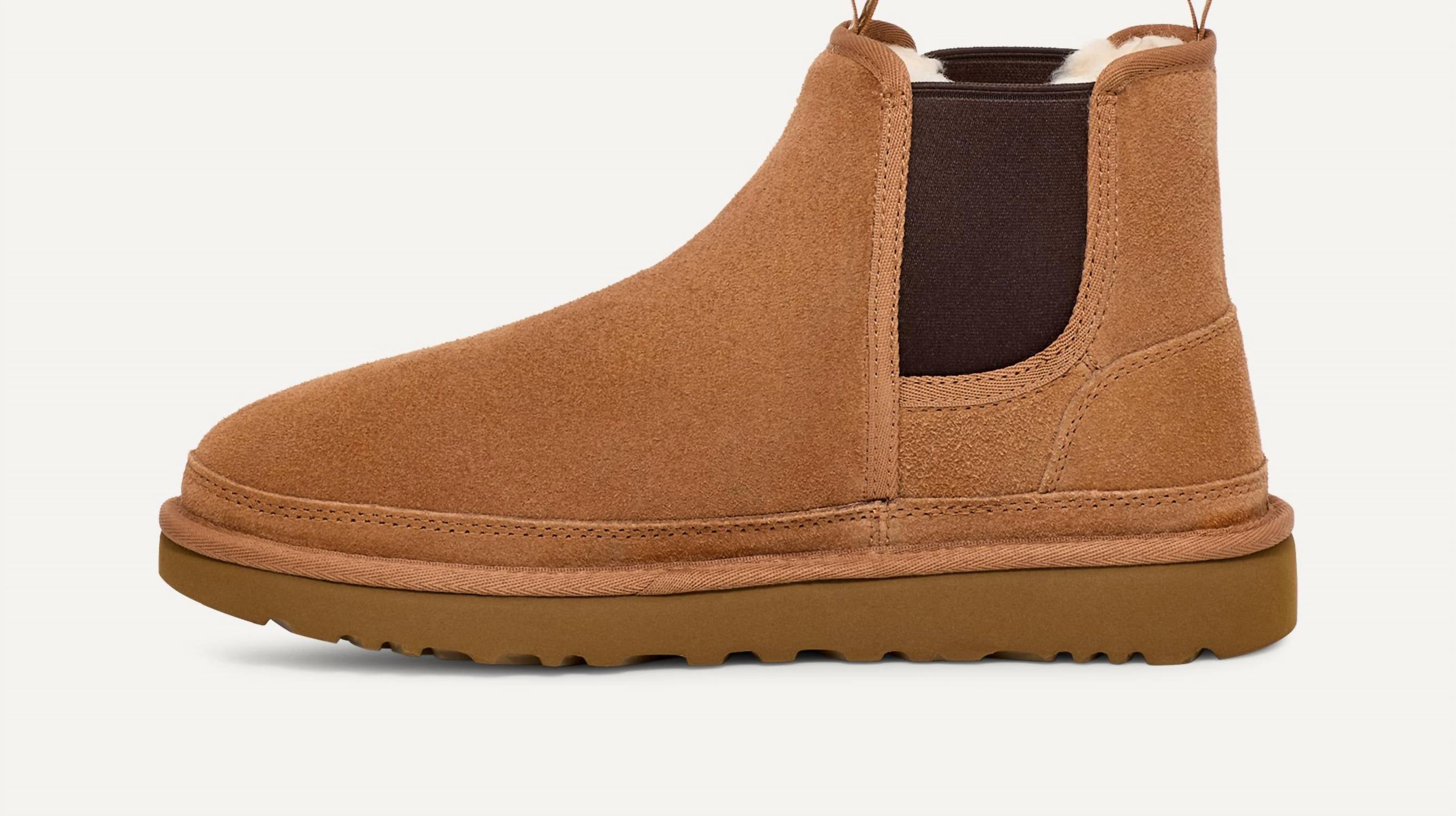 Adapting our timeless chukka silhouette with twin gore for easy entry and a refined finish, the Neumel Chelsea combines premium materials and effortless style. Made of rich suede, it's lined in our UGGplush™ wool blend and finished with a durable outsole – offering lightweight comfort and a flexible feel wherever you go.Item No. 1121644Suede upperElastic gore, Front pull tab, Rear pull tab, UGGbraid made with 100% recycled polyester fibers17mm UGGplush™ 80% upcycled wool, 20% TENCEL™ Lyocell lining or 17mm UGGplush™ 60% upcycled wool, 40% TENCEL™ Lyocell lining17mm UGGplush™ 80% upcycled wool, 20% TENCEL™ Lyocell sockliner or 17mm UGGplush™ 60% upcycled wool, 40% TENCEL™ Lyocell socklinerFoam footbedSugarcane EVA outsole or Treadlite by UGG™ EVA outsoleTextile binding made from 100% recycled polyester fibersHeat-embossed UGG® logoRN 88276