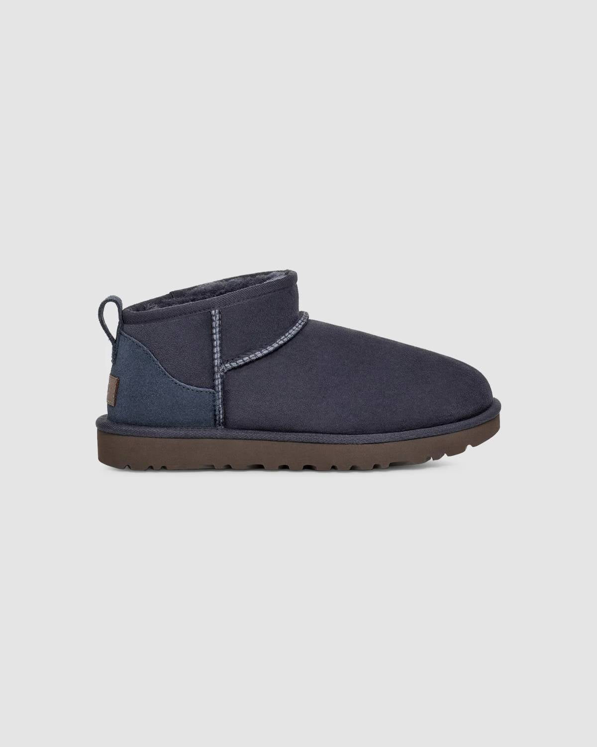 Say hello to the perfect, most versatile boot. The ankle height makes this style easily transition from day to night. Wear them with your favorite skinny jeans and tee for a more laid back look, or pair them with your favorite mini dress and jacket for a night out on the town. The Classic Ultra Mini is a highly sought-after boot featuring a 3.5" shaft for easy wear, pre-treated for durability, and made with 17mm Twinface sheepskin. It includes a flexible, ultra-lightweight Sugarcane EVA or Treadlite by UGG™ outsole, and an insole crafted from 80% upcycled wool and 20% TENCEL™ Lyocell, or a similar blend. This model is produced in women-supportive factories through HERproject, emphasizing sustainability with a water-repellent treatment and recycled polyester bindings. The boot showcases a stylish asymmetrical topline and a UGG® logo embossed leather heel label.