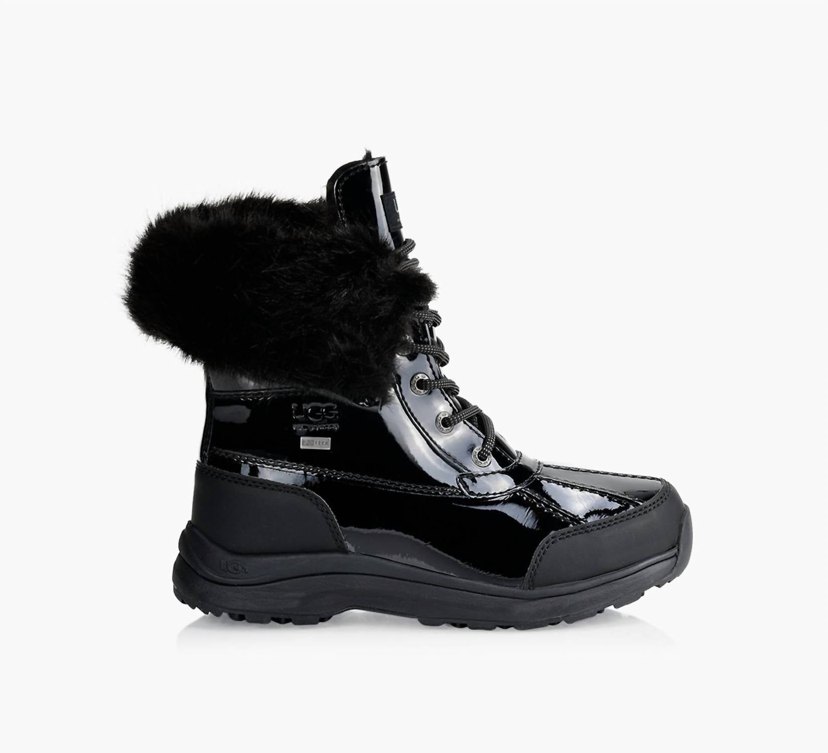 Introducing the Women's Adirondack Boot III Patent Boots by UGG, a stylish choice for winter and rain conditions. These boots boast a sleek patent leather exterior that enhances any winter outfit, complemented by a round toe shape and a flat heel under 1 inch. The boots feature a plush UGGpure wool lining and insole for warmth, with a rugged Vibram® rubber outsole providing superior traction, and are rated for temperatures as low as -32°C. With a lace-up closure and waterproof construction, these boots offer the perfect blend of fashion and functionality.