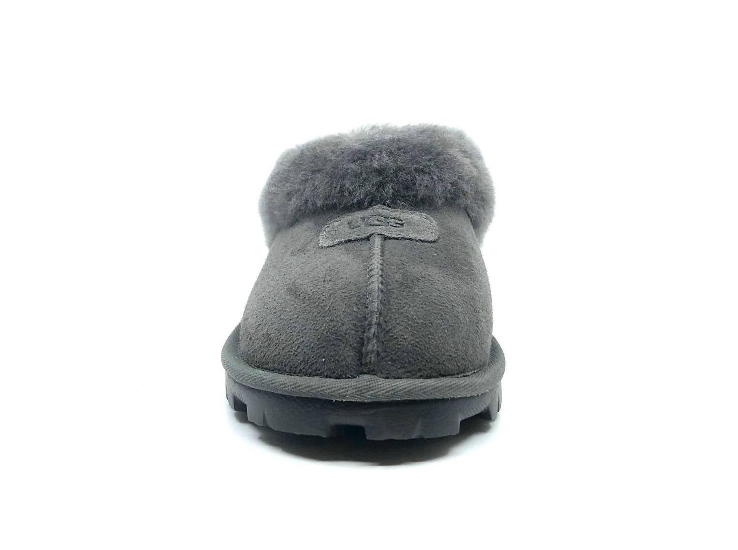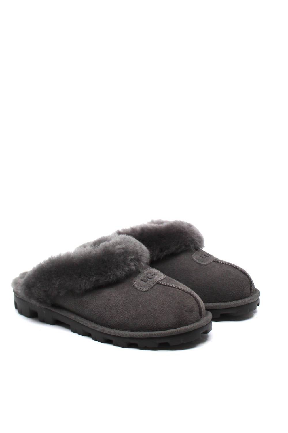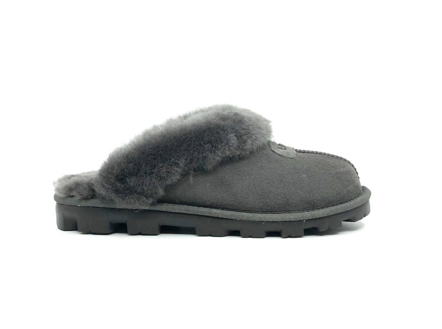 So comfy it's like you're walking on clouds. Meet the Women's Coquette by UGG, the ultimate slip-on slipper in grey that effortlessly combines style and comfort. This backless design is crafted with a 17mm Twinface sheepskin upper and insole, ensuring an indulgent feel with every step. The Treadlite by UGG outsole enhances comfort, while the polyester binding and suede label with an embossed UGG logo add an elegant touch. Ideal for casual outings or lounging at home, these flat-heeled slippers feature a round toe shape, making them both practical and chic.