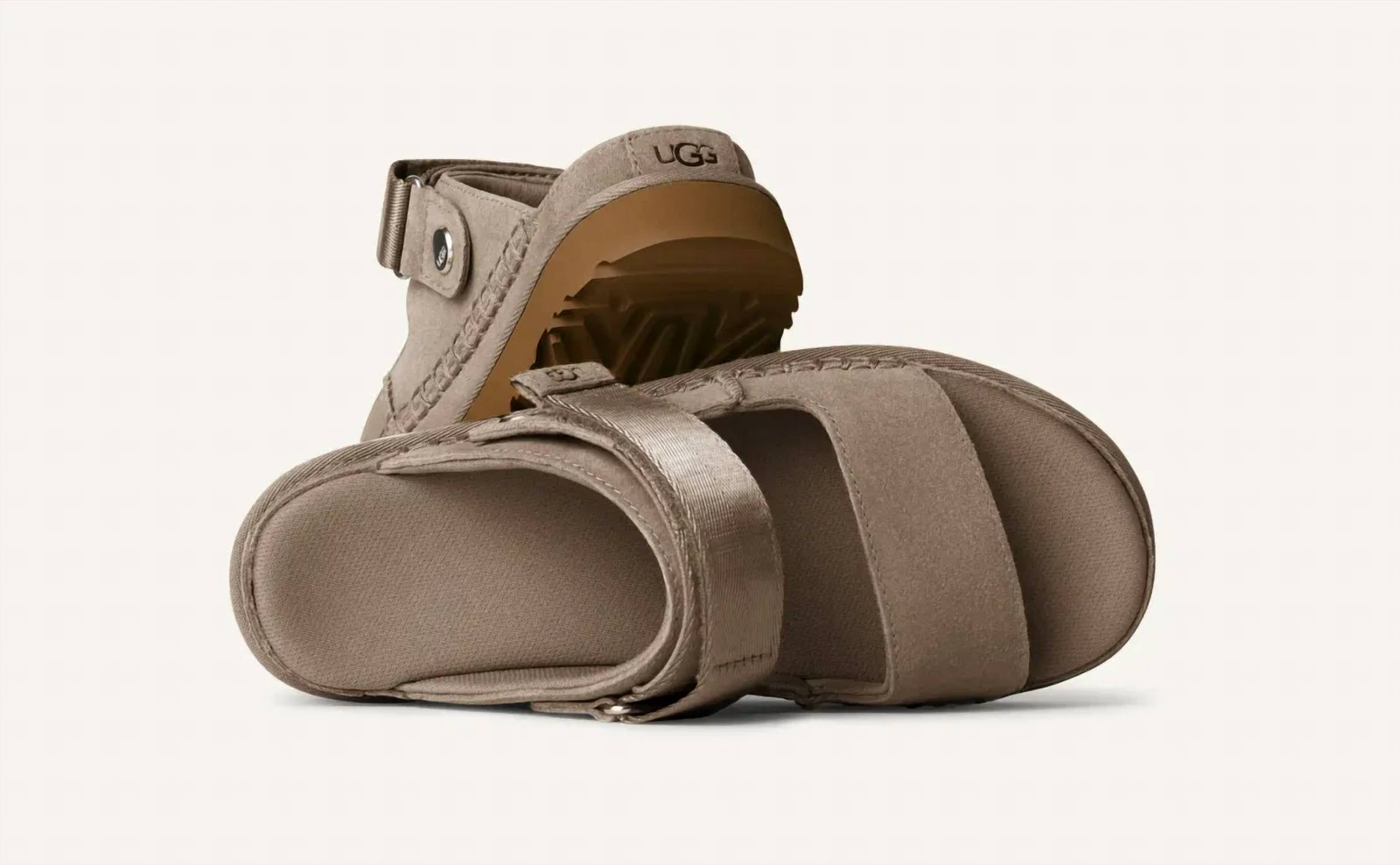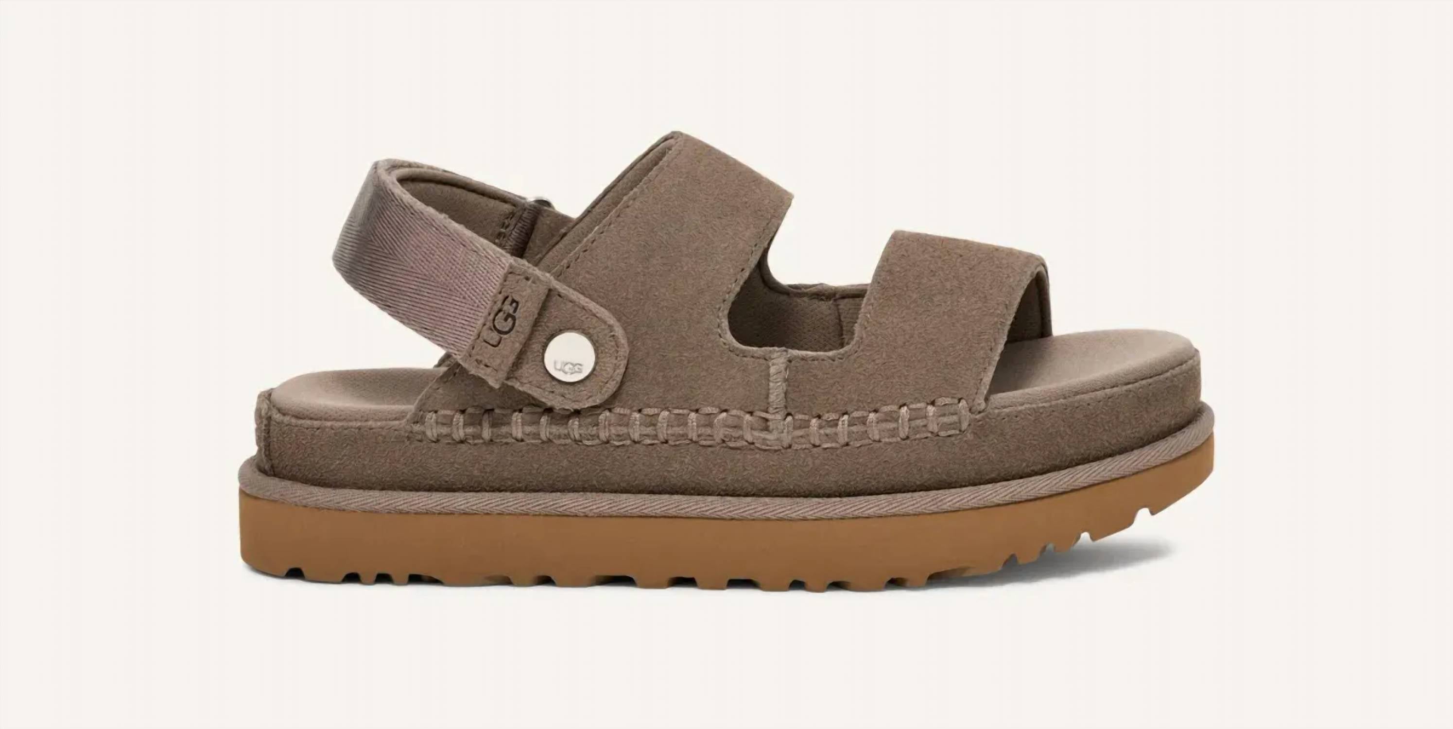Flowy dresses, cropped pants, and even jumpsuits... this sandal works with them all! Crafted from velvety suede, this versatile platform clog offers a wear-with-everything style. If you are reaching for a clog, you'll want comfort, and the Goldenstar Clog delivers! The heel strap features a swivel design for a 2-in-1 wearing option -- wear it as a heel strap or stacked on top for an easy on/off, open back option. An ultra-lightweight outsole provides all-day cushion and support. The outsole of this product is either a sugarcane EVA outsole, which is a responsible compound using sugarcane foam that allows us to reduce dependency on fossil fuels by replacing petroleum-based ethylene, or a Treadlite by UGG™ outsole. Item No. 1138252 Suede upper Webbing heel strap Adjustable heel strap, Hook-and-loop closure, TPU strap end with The Graphic UGG® Font Textile lining made from 100% recycled polyester fibers The sockliner textile is made with 100% recycled polyester fibers Contoured EVA footbed Sugarcane EVA midsole made with recycled EVA regrind Sugarcane EVA outsole Recycled polyester binding The UGG® Logo, embossed