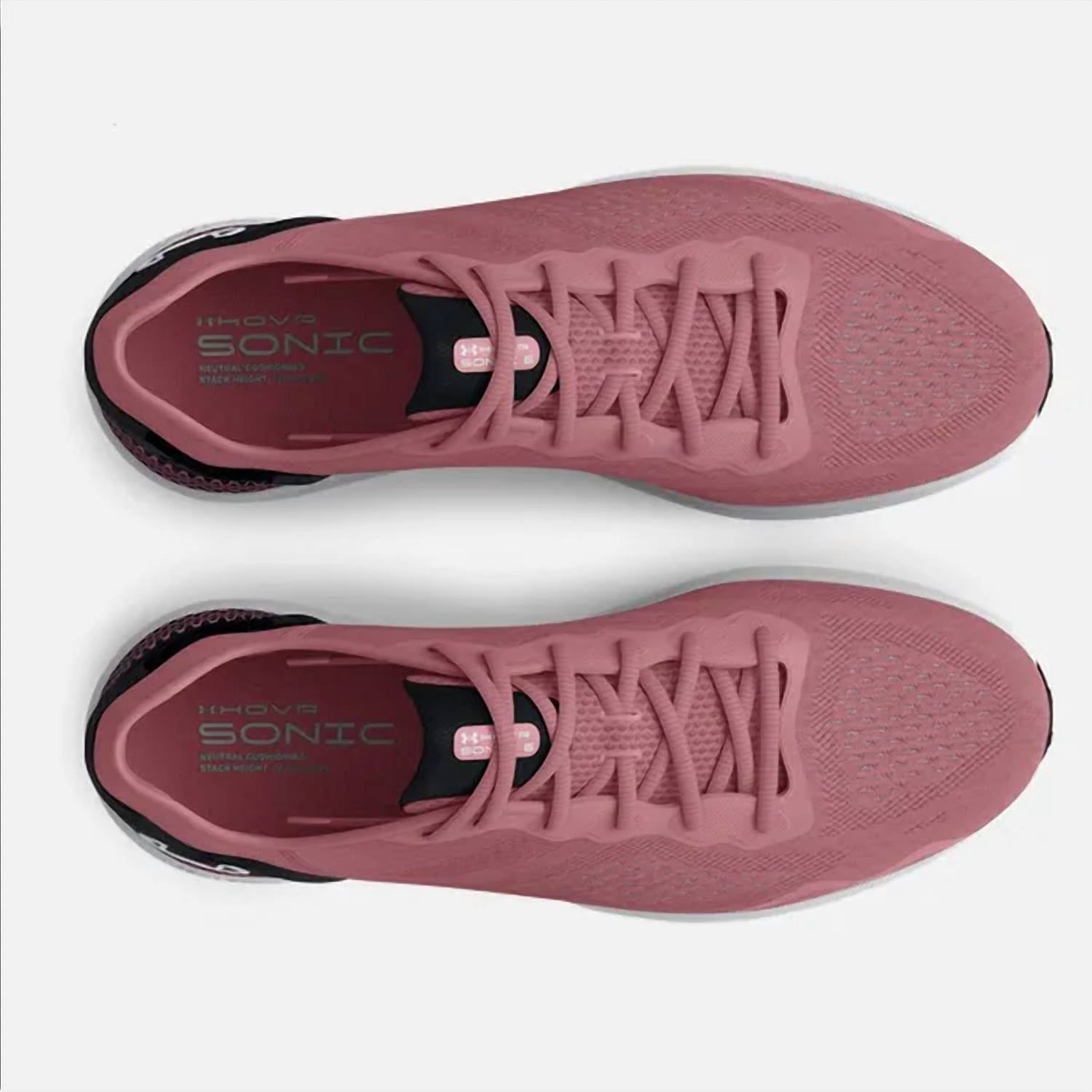 Cute, functional, and comfortable. These sneakers check all the boxes. Step into every run with the Women's UA HOVR Sonic 6 Running Shoe by Under Armour. Designed to be feather-light, this sneaker offers excellent support with its engineered mesh upper and seamless forefoot for comfort and breathability. The shoe features Under Armour's signature HOVR cushioning, which effectively reduces impact and pushes you forward, ideal for neutral runners needing both flexibility and cushioning. An updated outsole design enhances durability and rebound, while weighing just 9.9 oz with an 8mm offset, making it perfect for daily runs.