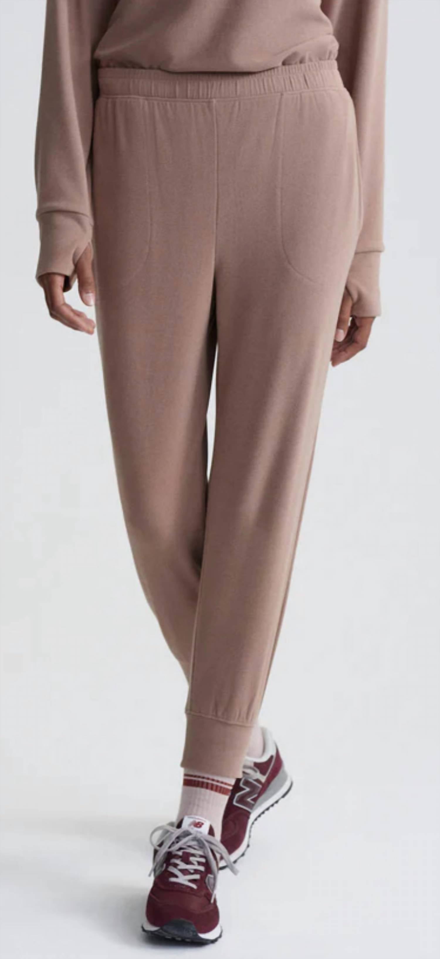 Pair these with your favorite sneakers for an effortlessly cool look. Meet the Brushed Rib Slim Cuff Pant by VARLEY, perfect for style-conscious women seeking comfort in Shadow Rose Marl. Featuring a high-rise fit with a tapering leg and a 25" length, it offers a chic silhouette. This solid-patterned pant is made from soft polyester, complete with pocket stitch detailing and an internal drawcord for a tailored fit. Closure: Pull on. Care: Machine wash and lay flat to dry. This piece effortlessly blends everyday charm with practicality for those on the go.
