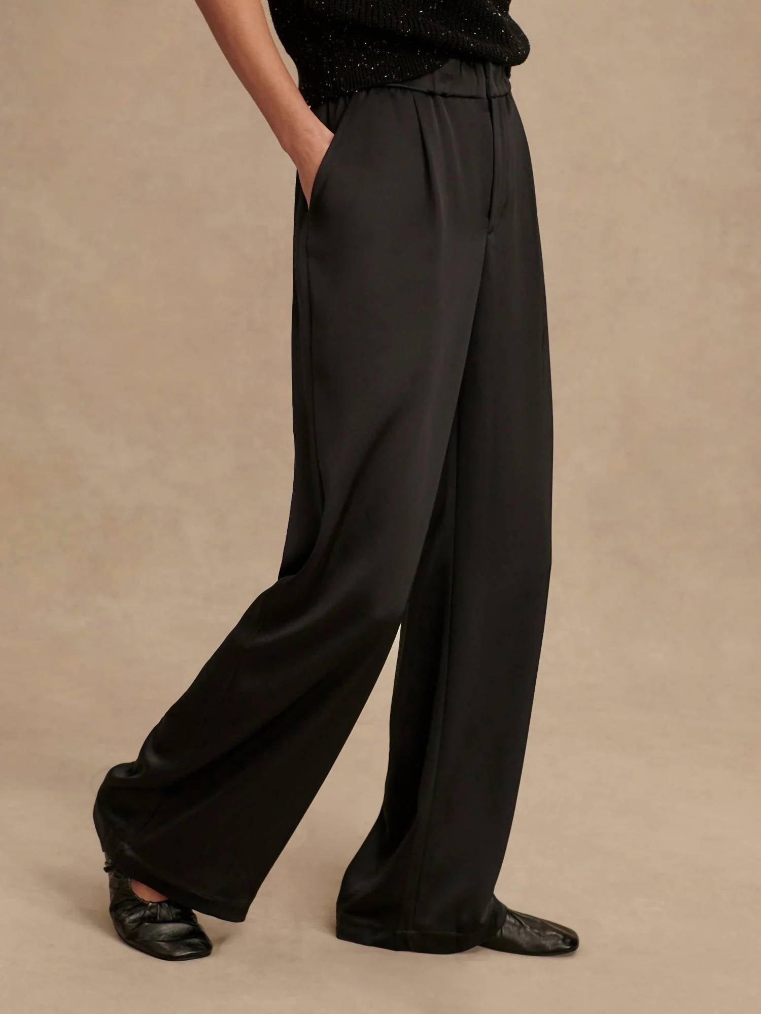 Introducing the Bryden Wide Leg Pants by VARLEY, a stylish statement piece crafted from new semi-gloss Sateen fabric in classic black. These wide-leg trousers feature elegant front pleats and side pockets, offering both functionality and flair. Composed of a relaxed fit with a high-rise elasticated waistband, they ensure comfort while maintaining a sleek silhouette. Closure: Pull on. Care: Hand wash. Ideal for spring travel or workwear occasions.