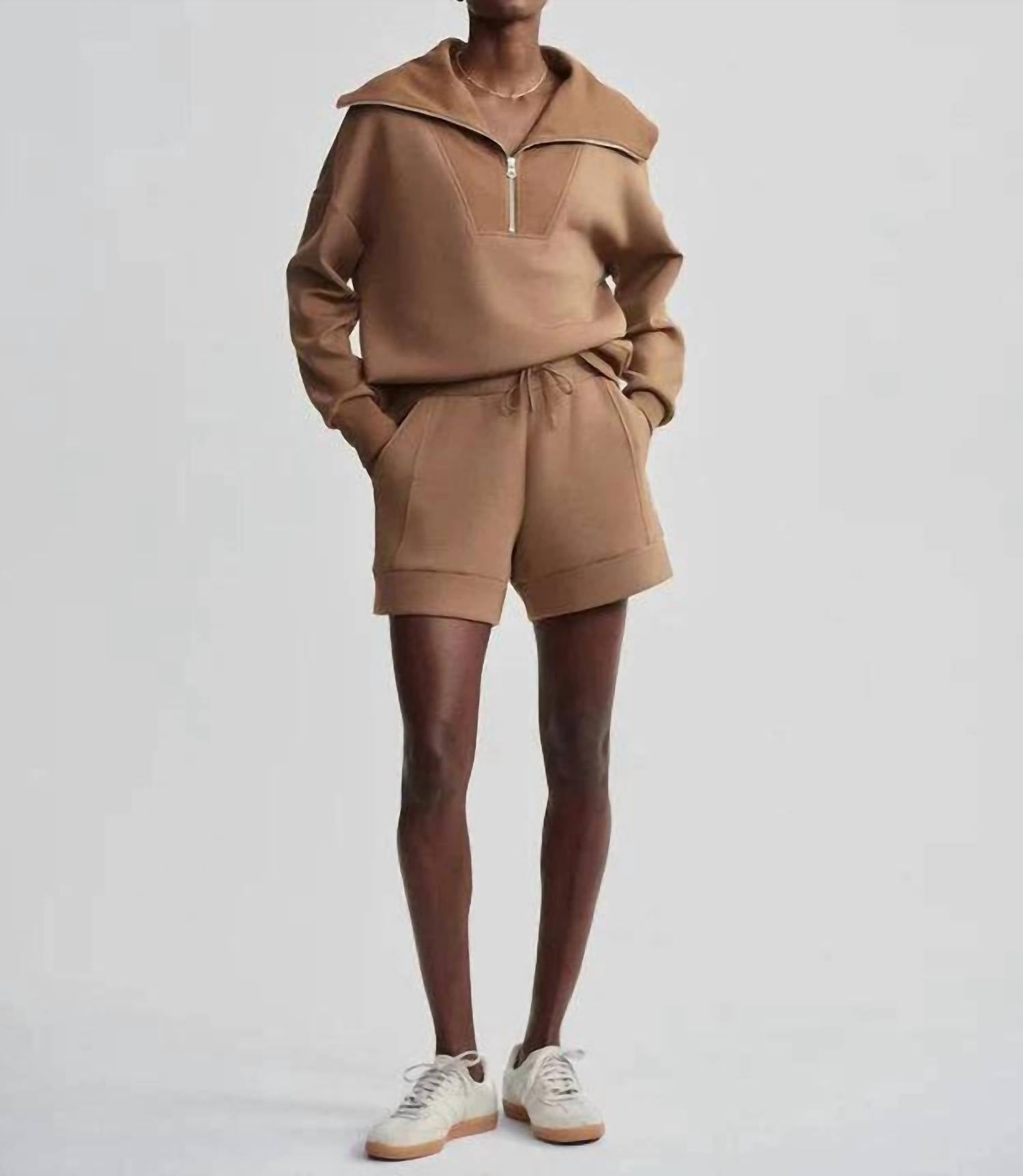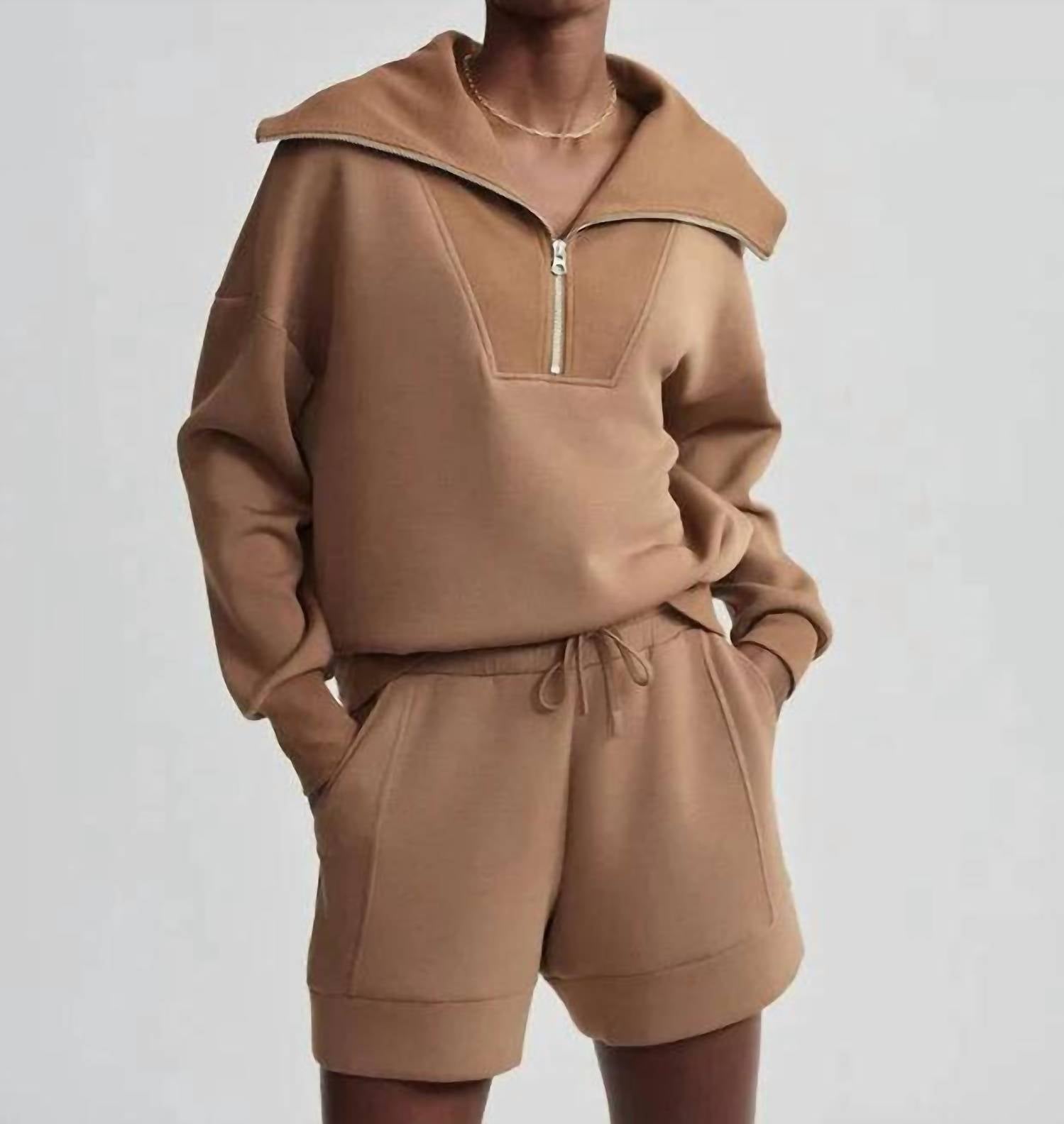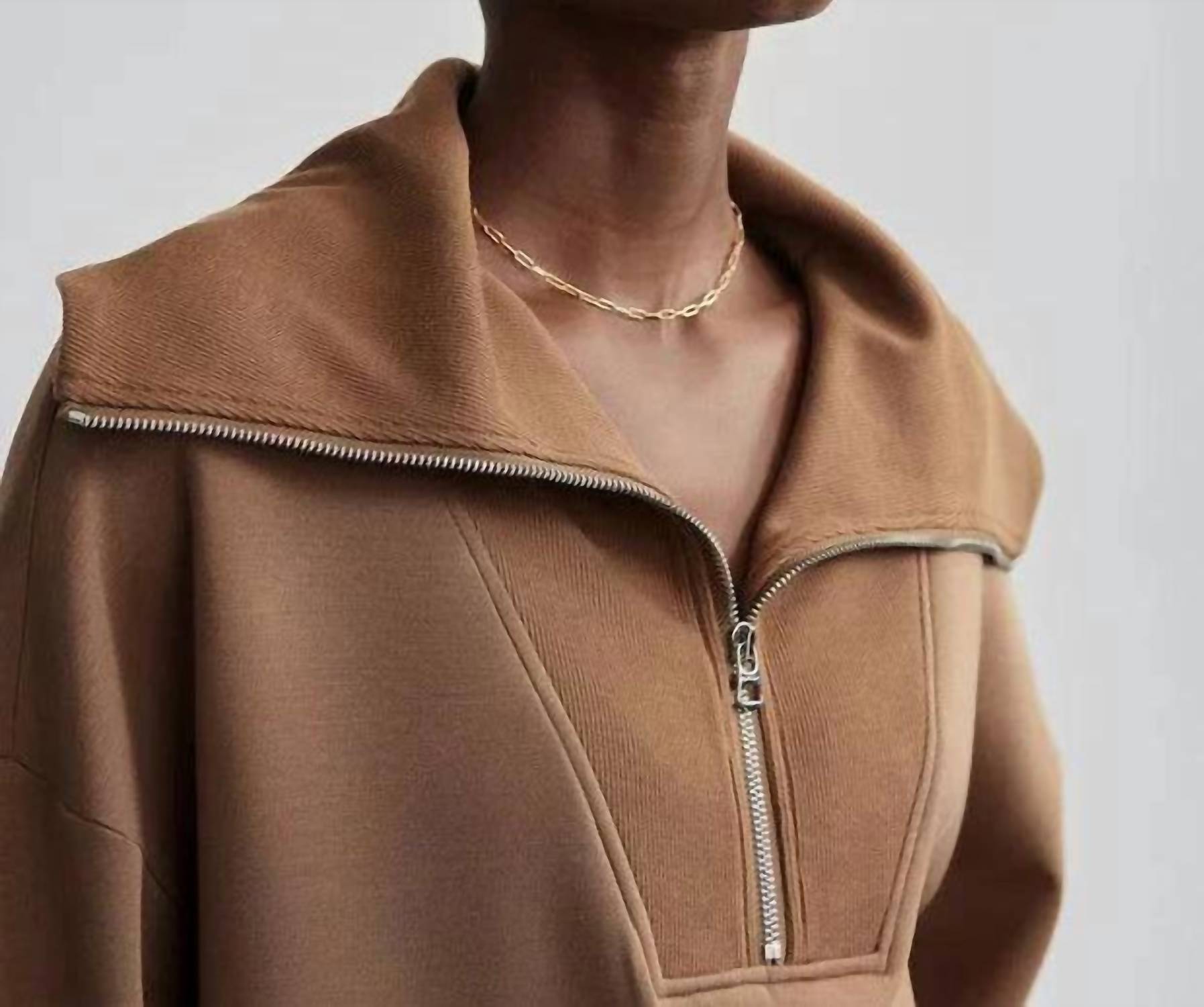 Stay chic with the Catherine Half Zip Sweater by VARLEY, an oversized casual jacket in a striking Golden Bronze. Designed with long sleeves and a collar neckline, this solid pattern piece is crafted from a viscose blend for a comfortable feel. Closure: Zip closure. Perfect for layering and everyday style, this sweater features a modern drop shoulder design, adding a stylish twist to any ensemble.