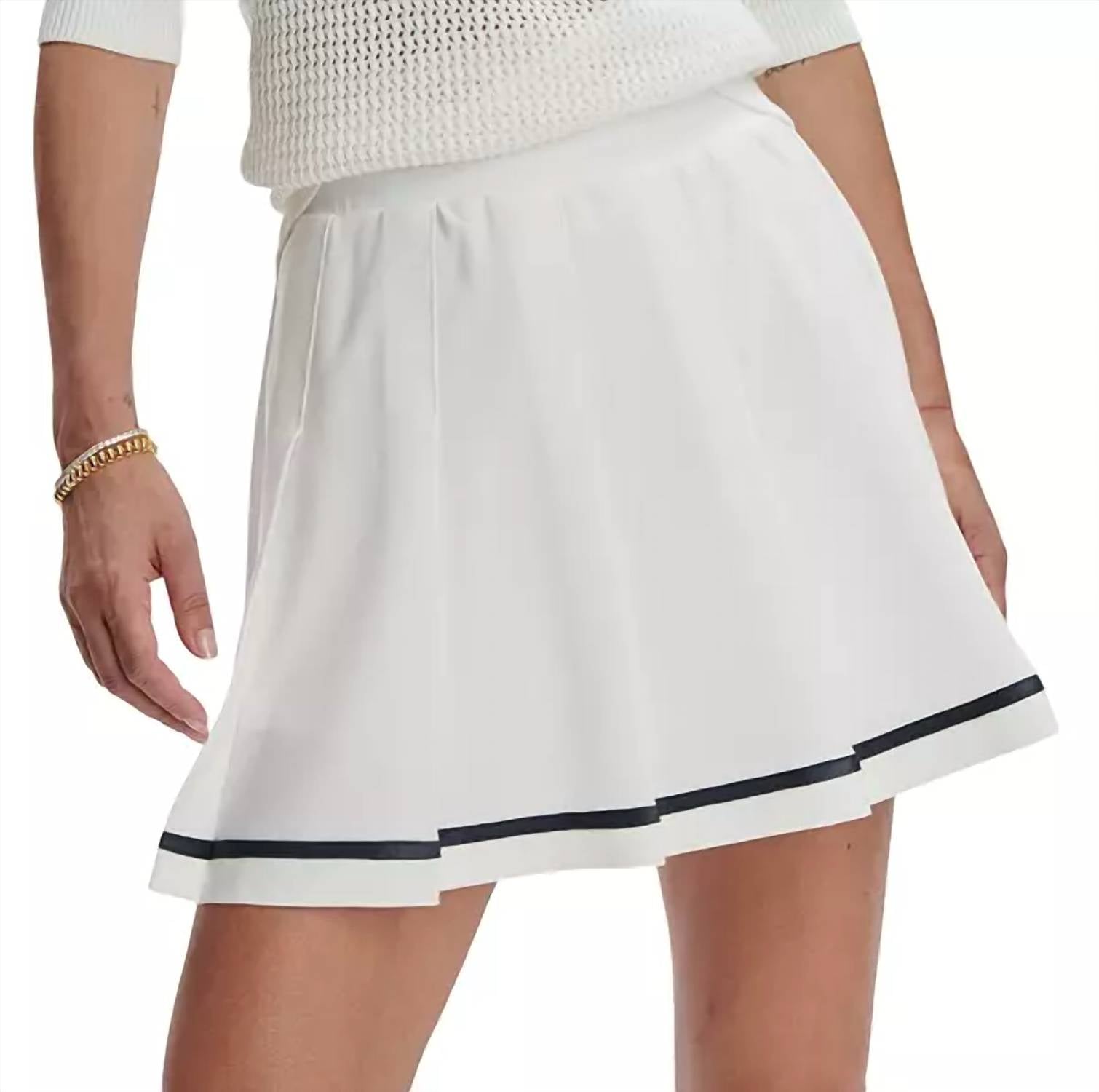 The go-anywhere and do-anything skort that you'll love to live in. Elevate your activewear with the Clarendon High Rise Skirt by VARLEY, designed for both style and functionality. Crafted from structured, breathable stretch twill, this elegant skort features a classic pleated design with a chic contrast tape detail at the hem. The skort is made of an outer skirt with 90% Polyester and 10% Elastane, while the inner short boasts 95% Polyester and 5% Elastane. Additionally, the built-in pocket shorts make it perfect for on-the-go, whether you're on the golf course or tennis court.
