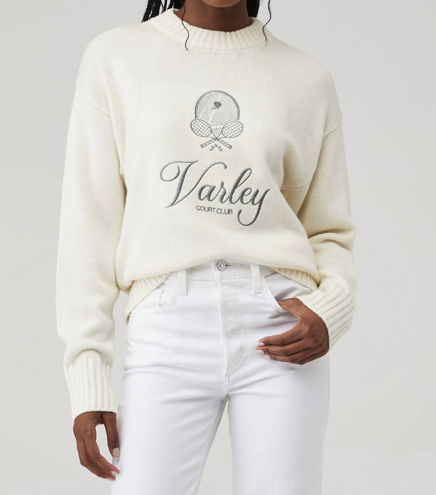 Experience the perfect blend of comfort and style with this trendy crew neck sweater, designed to effortlessly elevate your wardrobe. Pair it with your favorite denim and loafers for the perfect look. The Edie Namesake Knit Sweater by VARLEY is crafted for those who appreciate both style and comfort. Featuring long sleeves and a composition of 5% Cashmere, 20% Wool, 48% Nylon, and 27% Viscose, this sweater ensures warmth and softness. With a garment length of 23.6 inches, it boasts an off-white hue complemented by sage green embroidery and a pull-on closure for easy wear. Care for this luxurious piece by dry cleaning only.