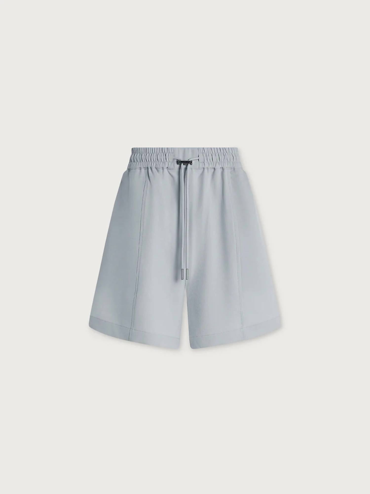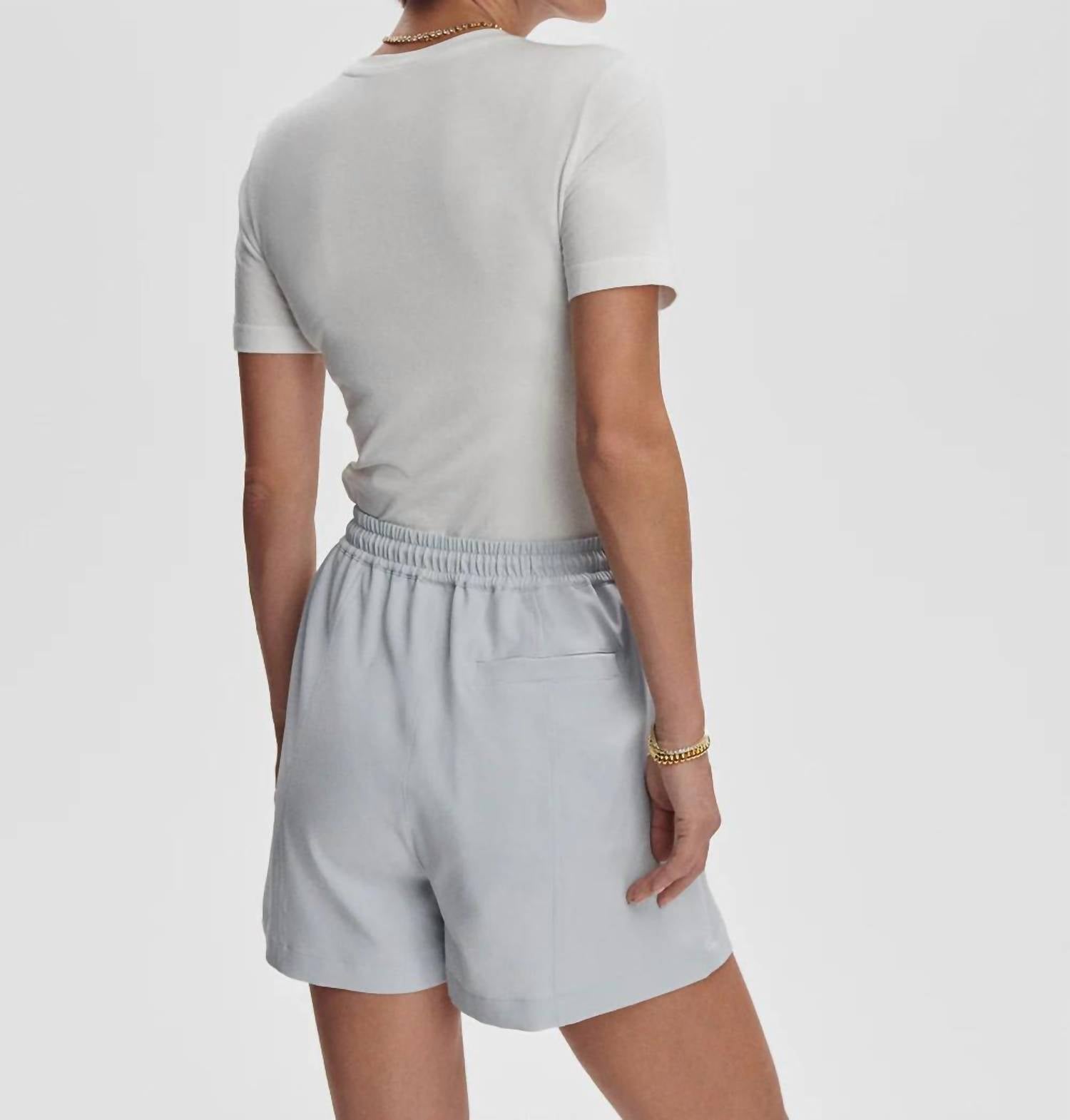 High-waist is here to stay and we especially love this style short. The VARLEY Esmond Short in Pearl Blue is crafted from lightweight Stretch Twill, combining 94% Polyester and 6% Elastane, making it perfect for summer travel or minimalist styling. These high-waisted shorts have a pull-on closure with an elasticated waistband and toggle for a customizable fit, featuring pockets for added convenience. Designed for women, the shorts have a front rise of 12.6 inches and an inseam of 3 inches, offering a solid pattern that complements any wardrobe. Care instructions: Hand wash. Import. The studio model wears a size small, with measurements of 5'9" height, 32" bust, 24" waist, and 34" hips.