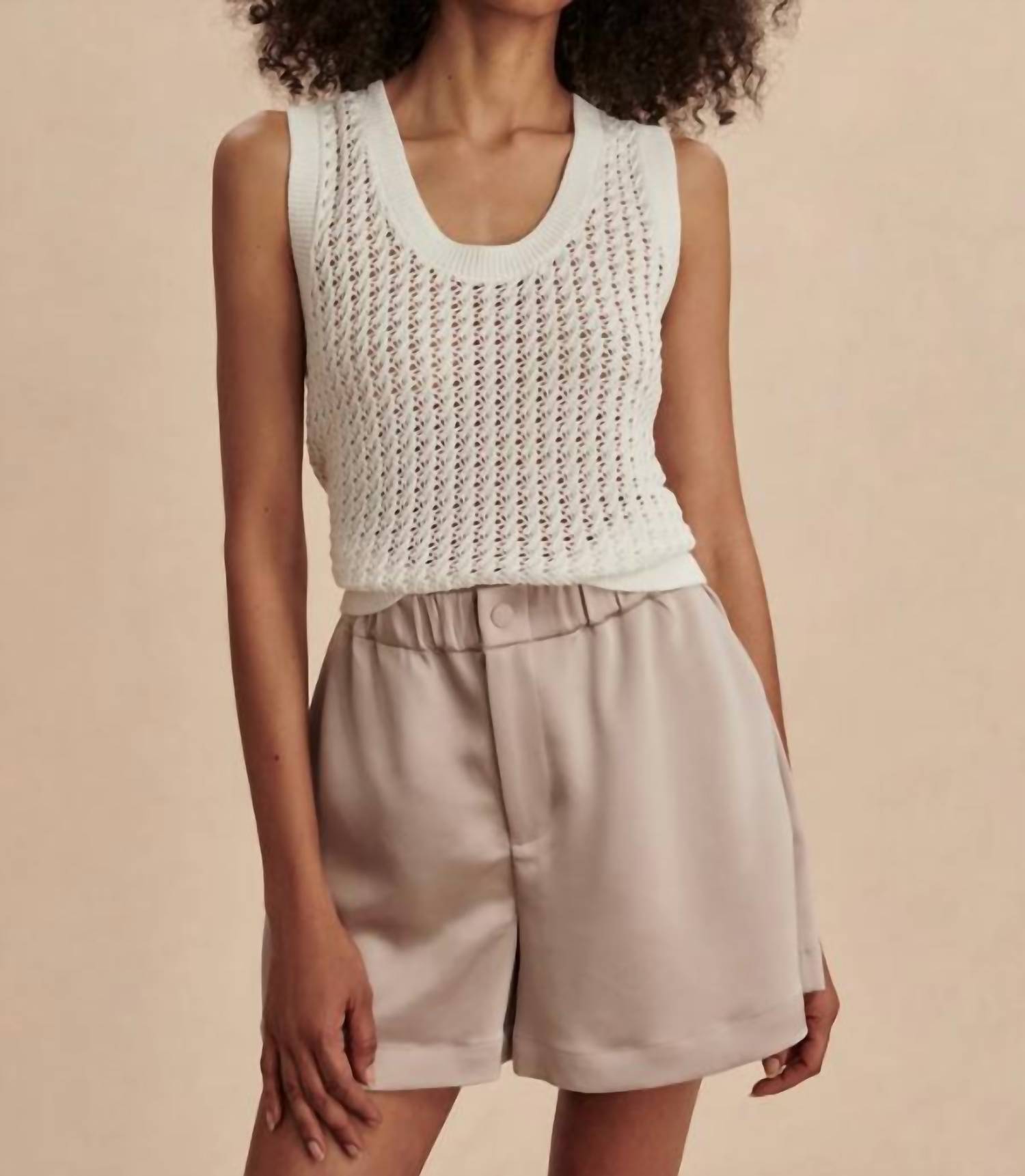 The perfect tank top for those warmer weather seasons. Introducing the Ferns Open Knit Tank by VARLEY, a chic addition to your summer wardrobe in Snow White. This sleeveless tank combines style and comfort with its scoopneck design and is crafted from 100% cotton for a breathable, lightweight feel. Designed with a solid pattern and a modern pull-on closure, it's your go-to piece for both casual outings and activewear needs. Machine wash cool, do not bleach, avoid tumble drying, iron on low, and dry flat—reshape while damp for best results.