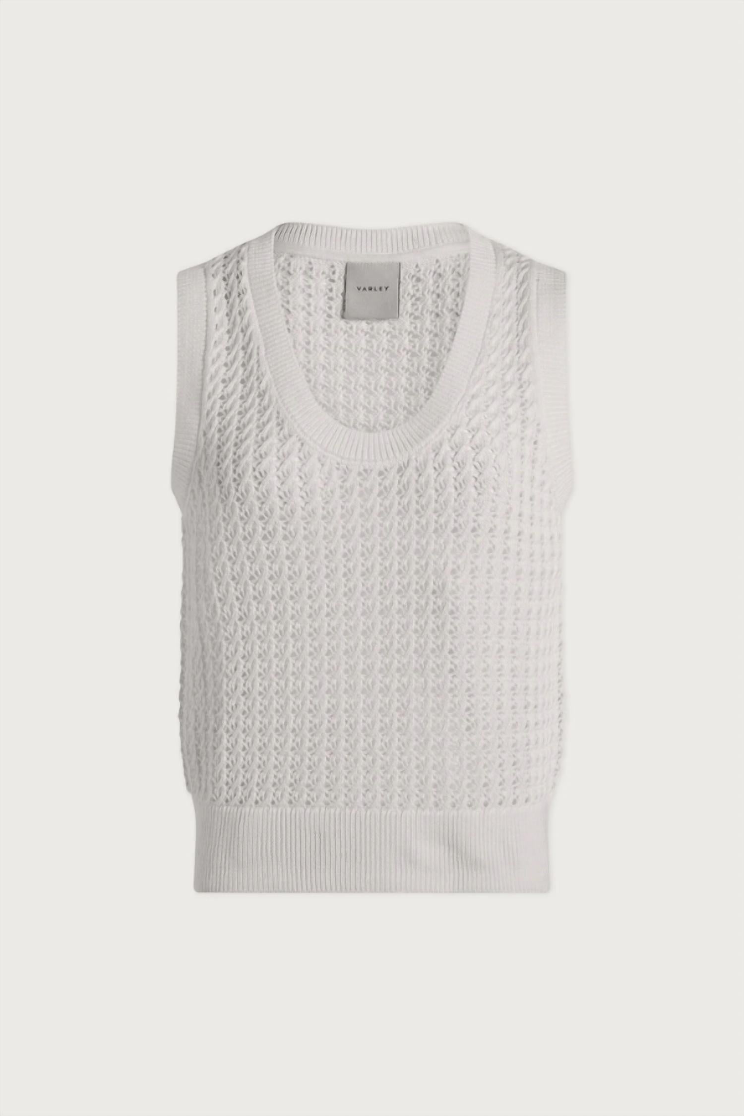 Introducing the Ferns Open Knit Tank by VARLEY, a chic addition to your summer wardrobe in Snow White. This sleeveless tank combines style and comfort with its scoopneck design and is crafted from 100% cotton for a breathable, lightweight feel. Designed with a solid pattern and a modern pull-on closure, it's your go-to piece for both casual outings and activewear needs. Machine wash cool, do not bleach, avoid tumble drying, iron on low, and dry flat—reshape while damp for best results.