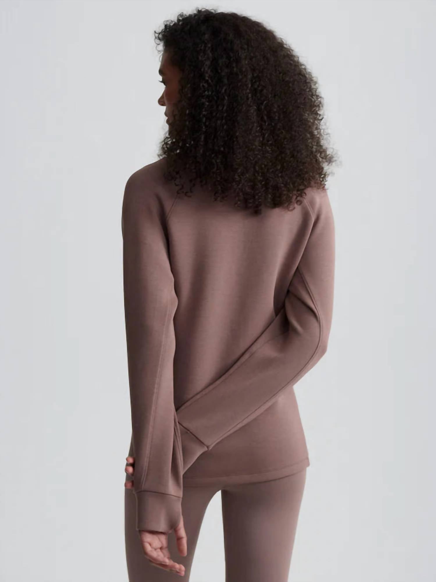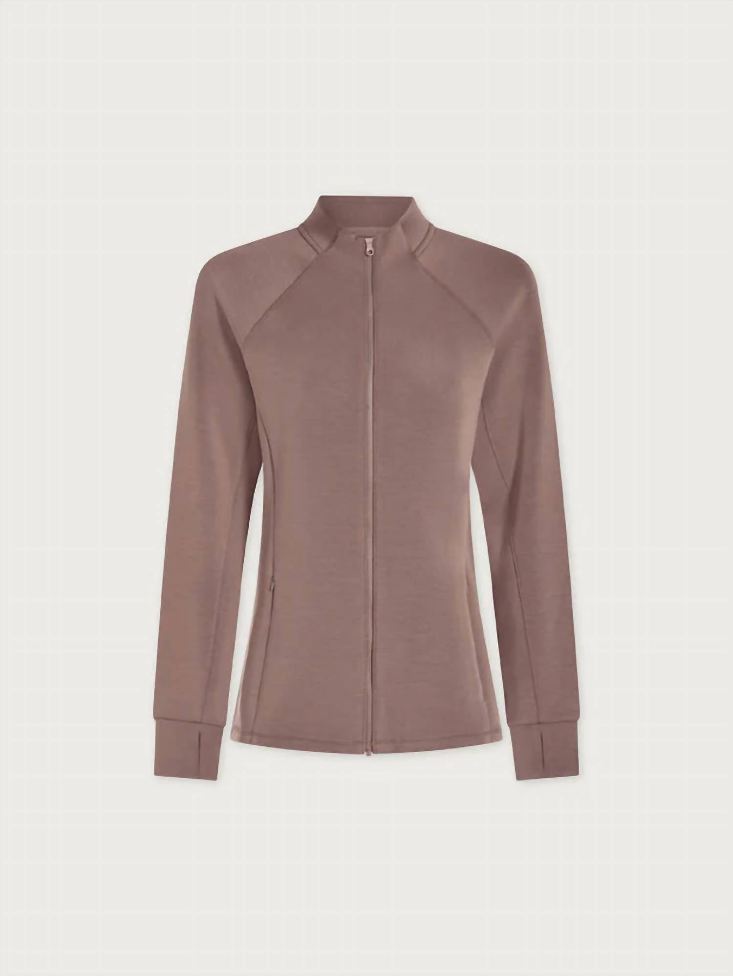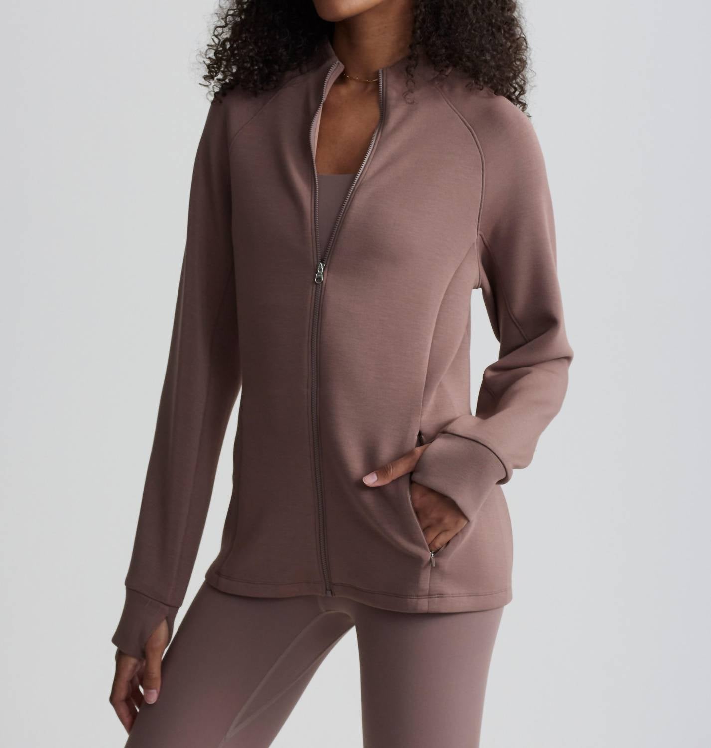 Whether you're running around town or lounging at home, this sweatshirt works for both. The Varley Hayden Zip Through Sweatshirt in Deep Taupe fuses comfort with sophistication, perfect for stylish layering. This long sleeve, slim fit piece offers a chic mock neck and a practical zip closure, ensuring a sleek silhouette. Crafted from a blend of 47% Modal, 46% Polyester, and 7% Elastane, it promises a soft yet resilient fabric. Care Instructions: Machine wash cool; do not bleach, tumble dry, or iron; dry flat by removing promptly from washer.