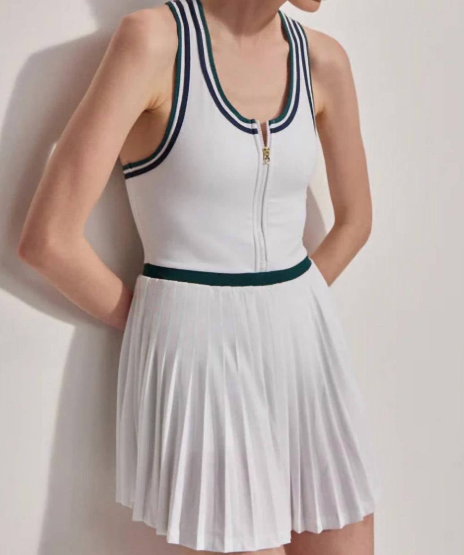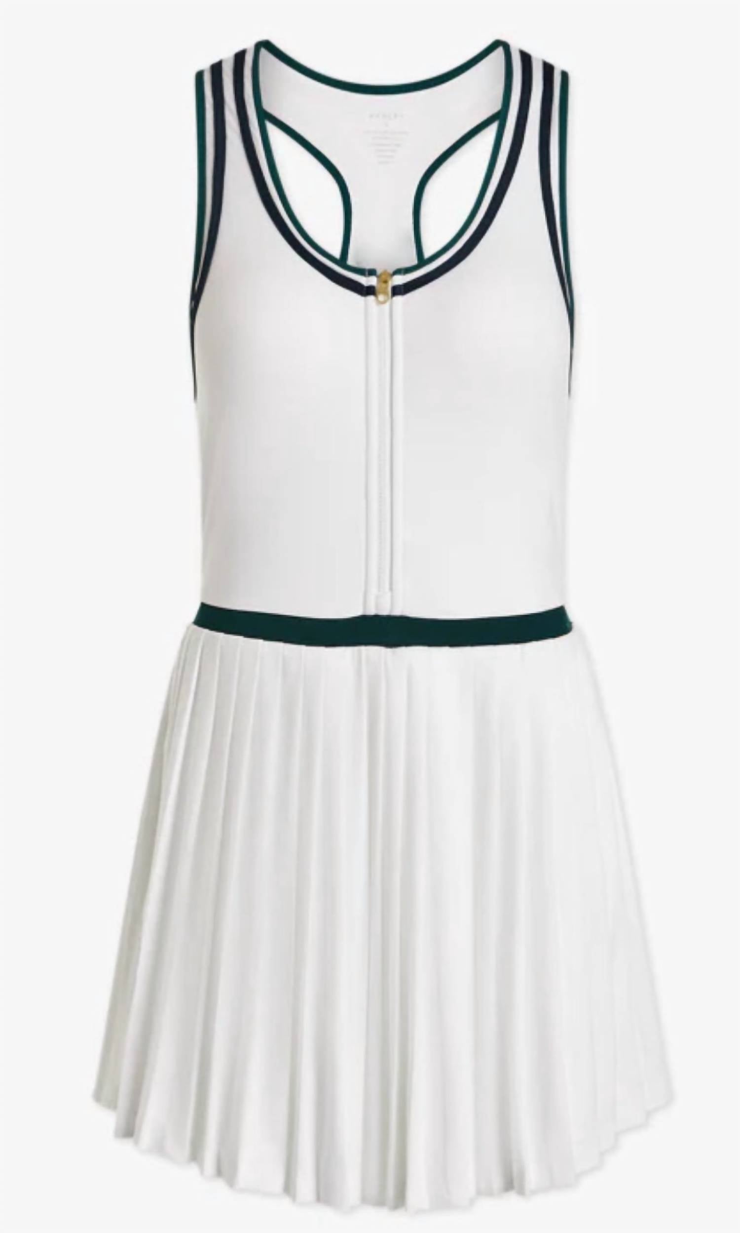 The perfect mini dress for those warmer months. Elevate your sporty wardrobe with the Jane Court Dress by VARLEY, a chic blend of style and sustainability. This sleeveless dress in white with navy and forest trim showcases a timeless A-line silhouette complemented by a pleated skirt and scoop neckline. Crafted from 88% recycled polyester and 12% elastane, it features a zip closure and is fully lined with removable cups for added comfort and convenience. Care is easy with machine wash instructions.