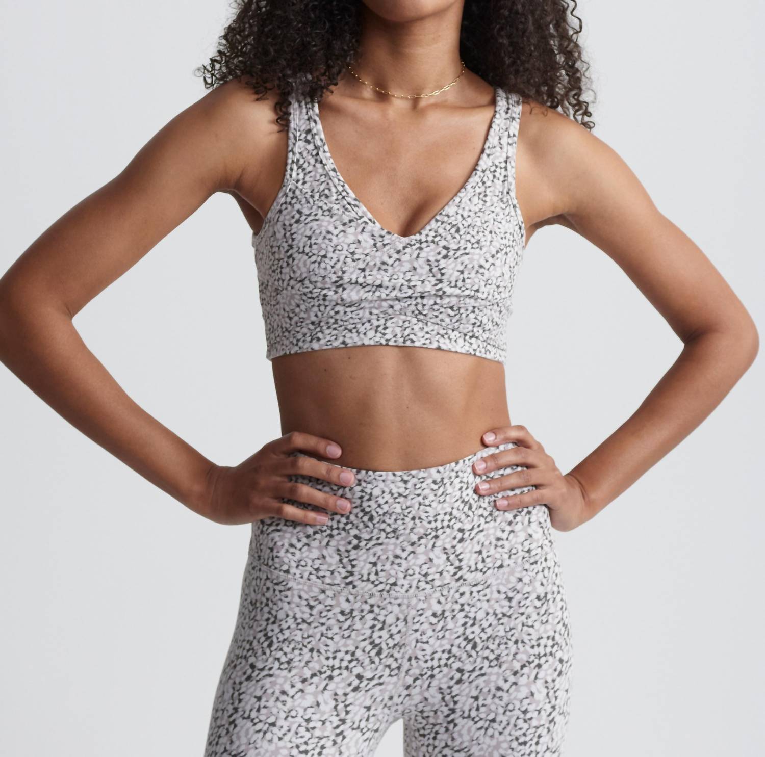So comfortable you can sleep in it, lounge in it, or work out in it. Introducing the Move Kellam Bra by VARLEY in a striking Mono Distorted Cheetah pattern, an essential for active women seeking style and support. Crafted from comfortable polyester, it features removable cups for a customizable fit and a scooped back for a chic look. This sports bra is imported and fits true to size. Care instructions: machine wash and lay flat to dry.