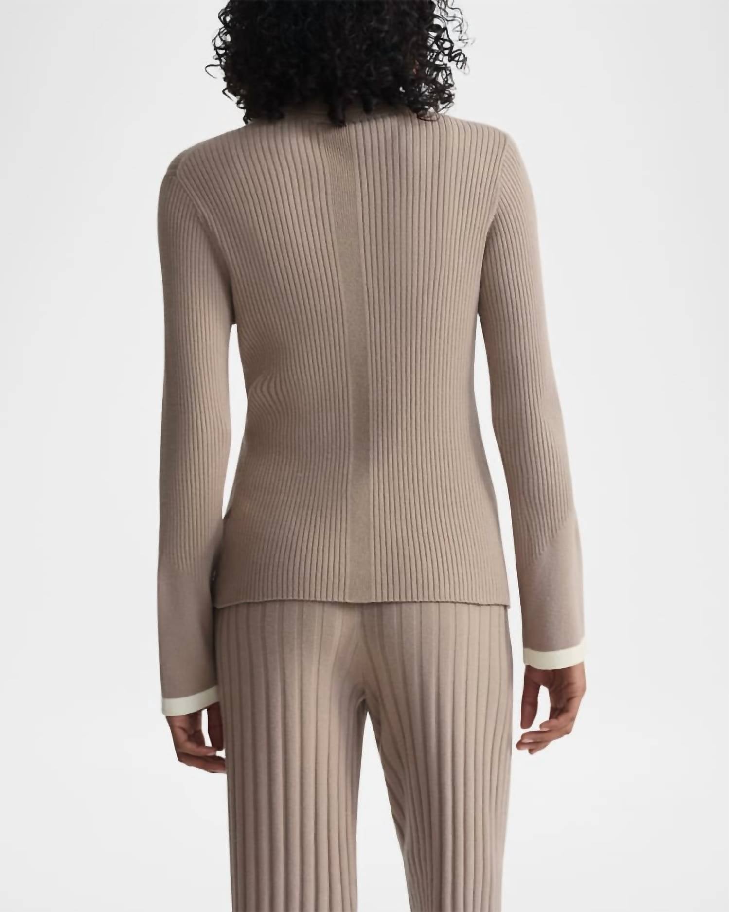A timeless blouse that will never go out of style. Elevate your wardrobe with the Ravena Rib Knit High Neck Top by VARLEY, presented in a sophisticated fungi hue. This women's blouse features long sleeves and a turtleneck design, crafted from a textured viscose blend for a slim fit that transitions effortlessly through the seasons. Composition: 50% Viscose, 30% Polyester, 20% Nylon. Closure: Pull-on style. Care: Machine wash cool, lay flat to dry, do not bleach, avoid tumble drying, iron on low, and reshape while damp. Size S dimensions include a front length of 24" and sleeve length of 24". Model (5'9.5") wears size small with measurements 33" bust, 23" waist, 34" hips.