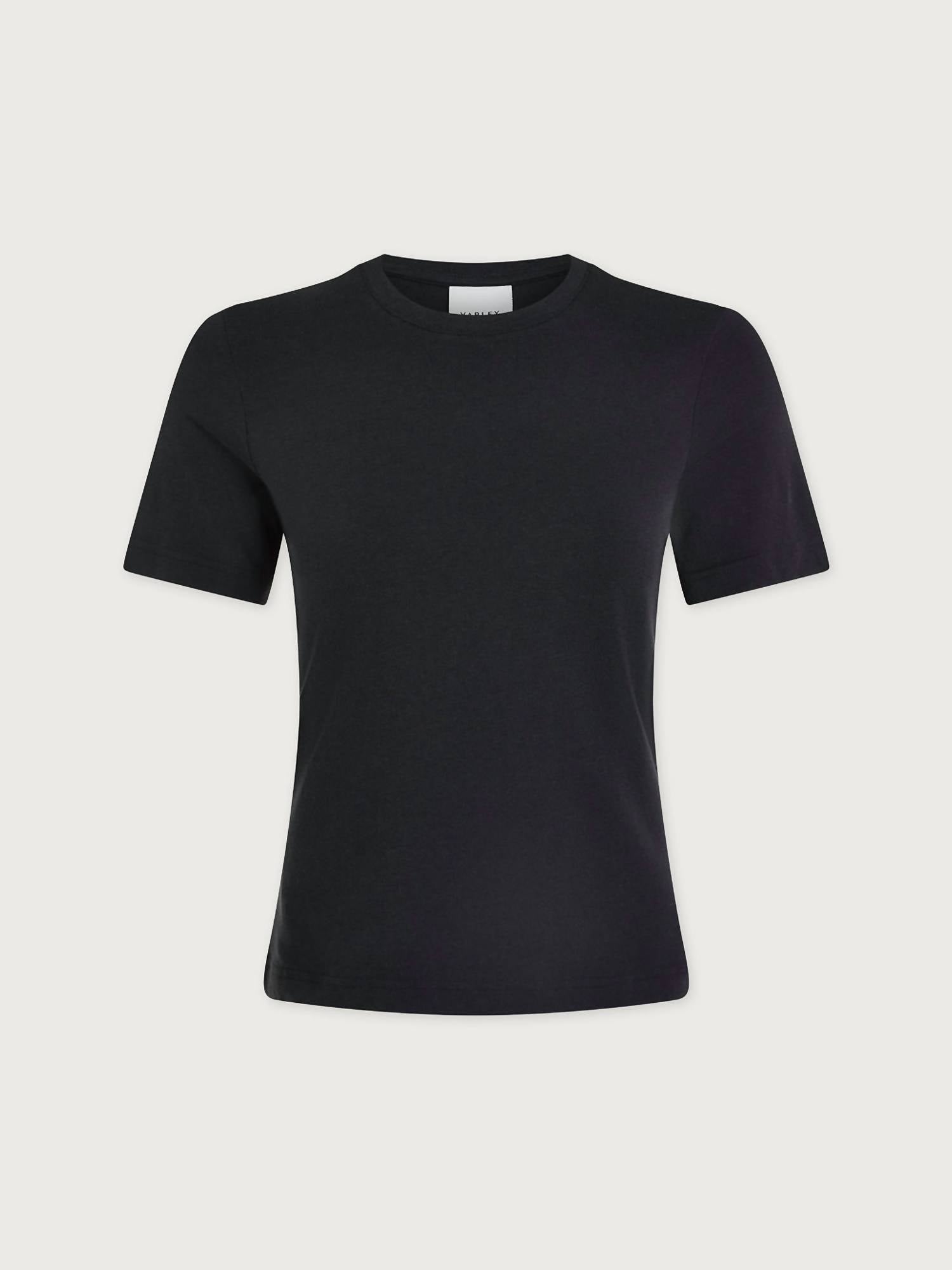 Look no further, you just found your perfect tee! Elevate your basics with the Regina Fitted Short Sleeve Top by VARLEY, perfect for sophisticated styling in black. Constructed from a soft blend of 50% Cotton, 45% Modal, and 5% Elastane, this solid crewneck tee offers comfort and breathability. Its pull-on closure ensures ease of wear. For best results, machine wash on a cool gentle cycle and dry flat.