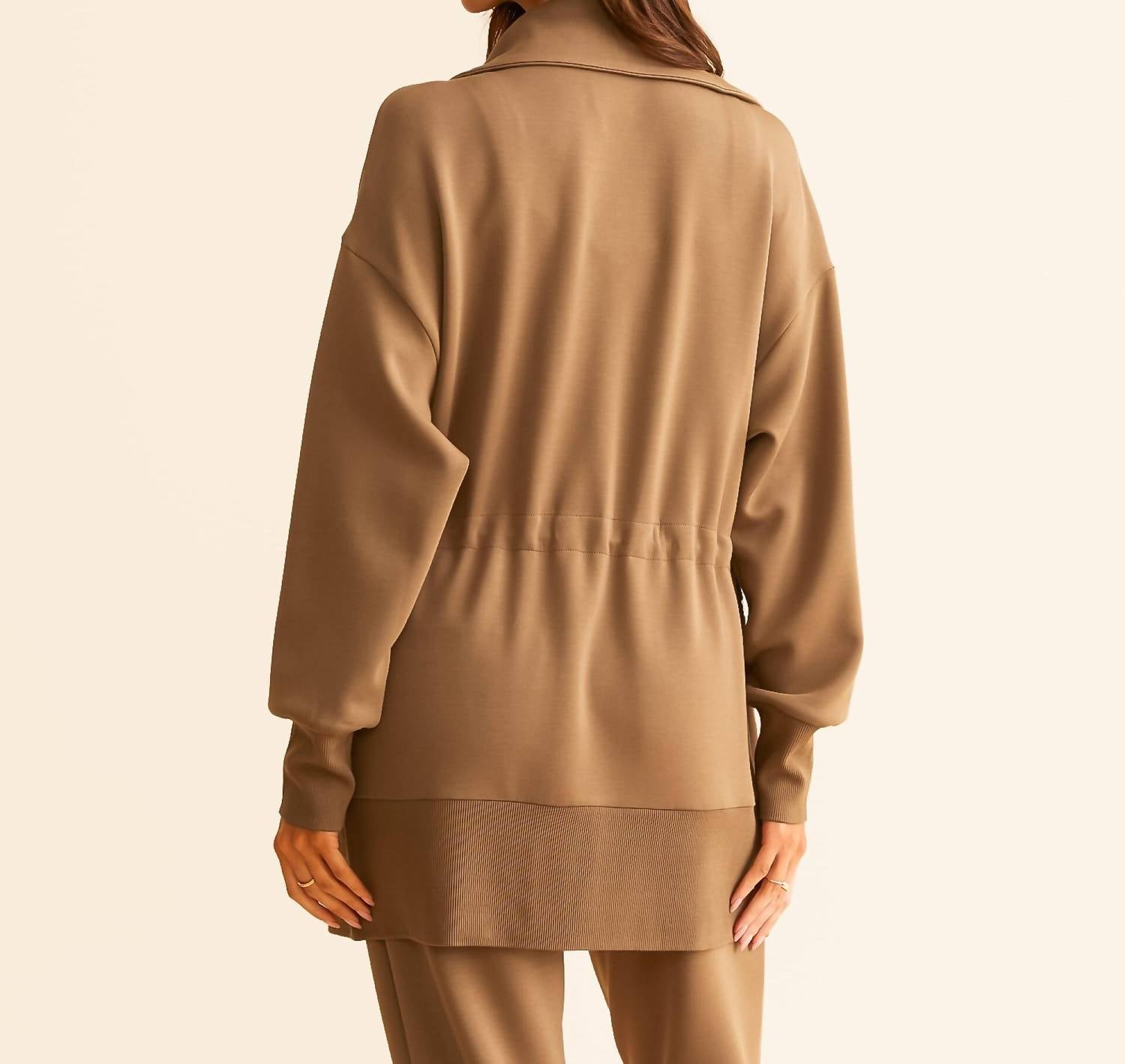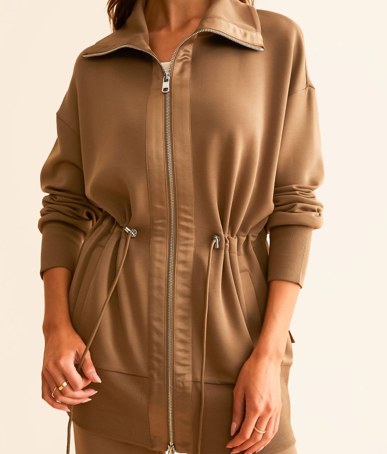 A jacket so versatile you can literally wear it with anything. Introducing the Ridgefield Longline Jacket by VARLEY, crafted in the rich Golden Bronze hue to elevate your wardrobe. Designed with long sleeves, this jacket is composed of a double layer Viscose blend, featuring a high neck and a sophisticated satin trim for a stylish touch. This jacket, which includes functional pockets, boasts a relaxed fit with a waist cinch and is secured with a zip closure. For care, fasten zips before machine washing cool with like colors inside out on a gentle cycle, dry flat, and iron low. Perfect for travel in the fall season.