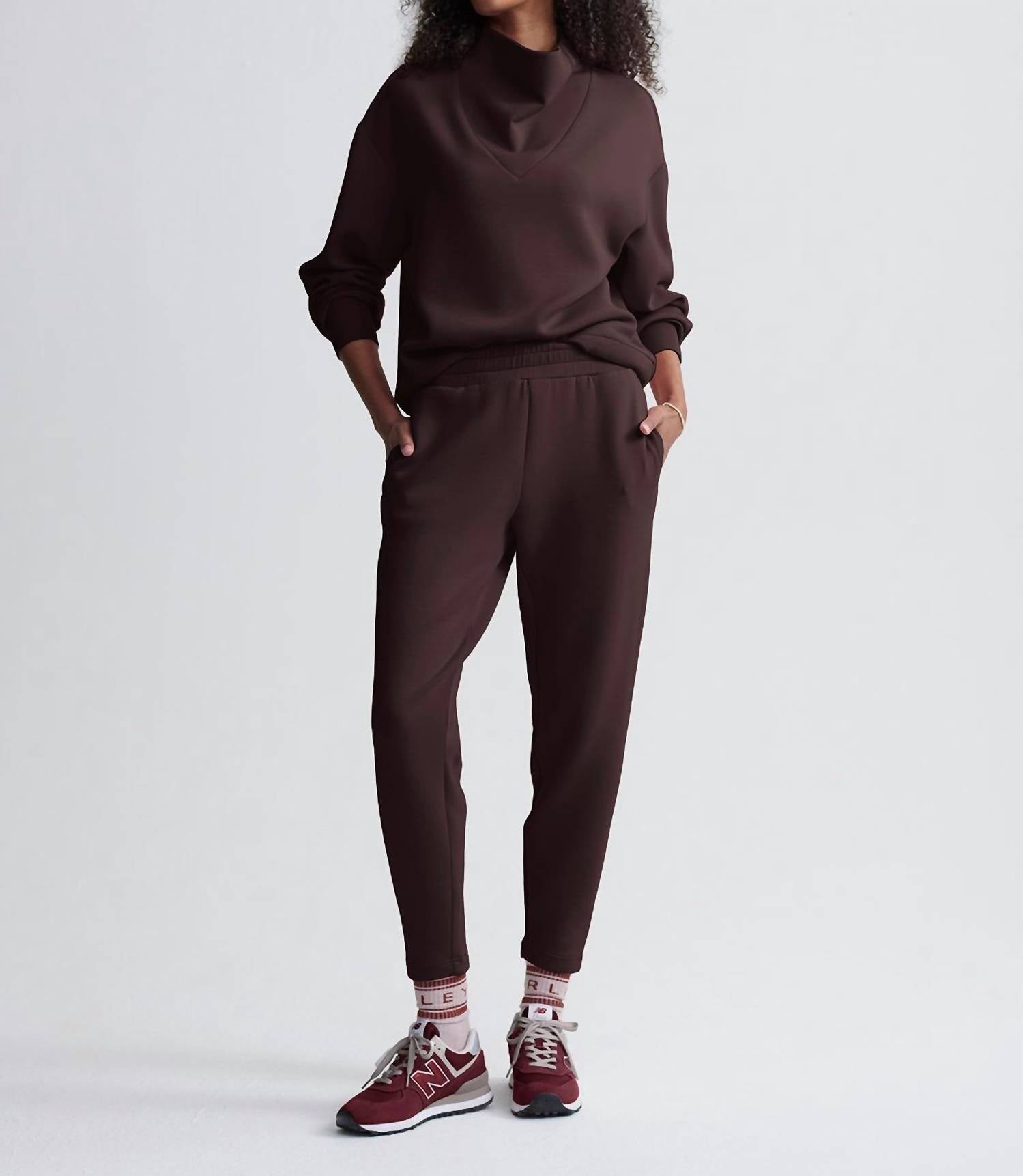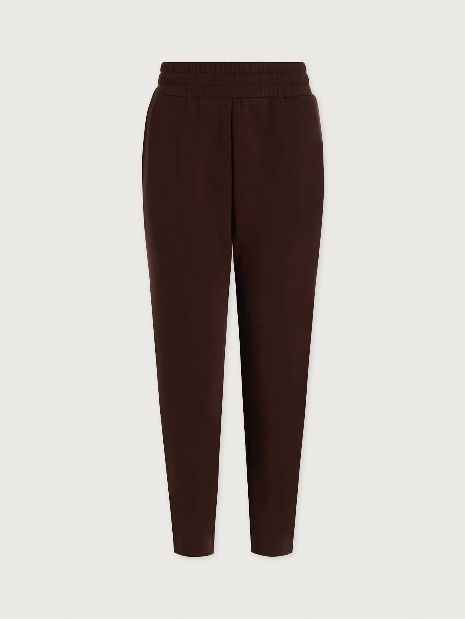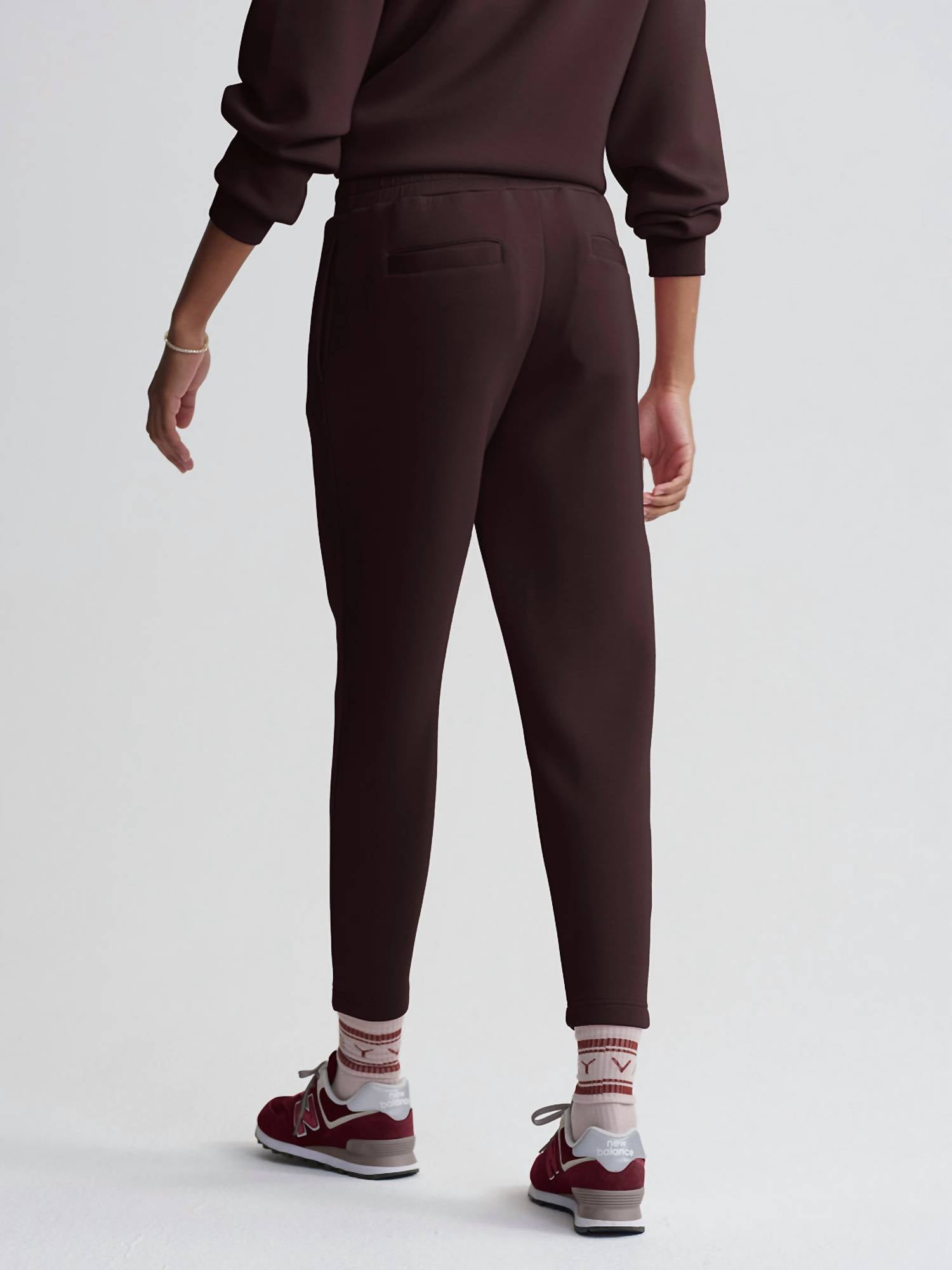 Discover the VARLEY Slim Tapered Leg Sweatpants in the rich Coffee Bean color, an essential for minimalist, relaxed dressing. Crafted from a viscose blend, these sweatpants feature a pull-on closure and ribbed waistband, ensuring both comfort and style. With a 25" inseam and tapered leg design, they offer a modern, slim fit perfect for vacation lounging. Composition: 2% Viscose, 23% Polyester, 5% Elastane. Care: Machine wash cool on gentle cycle, wash with similar colors, tie cords before wash, dry flat, turn inside out before wash, and remove promptly from washer. Model is 5'9.5", with a 23" waist, 34" hips, and wears a size small with a 27.5" length.