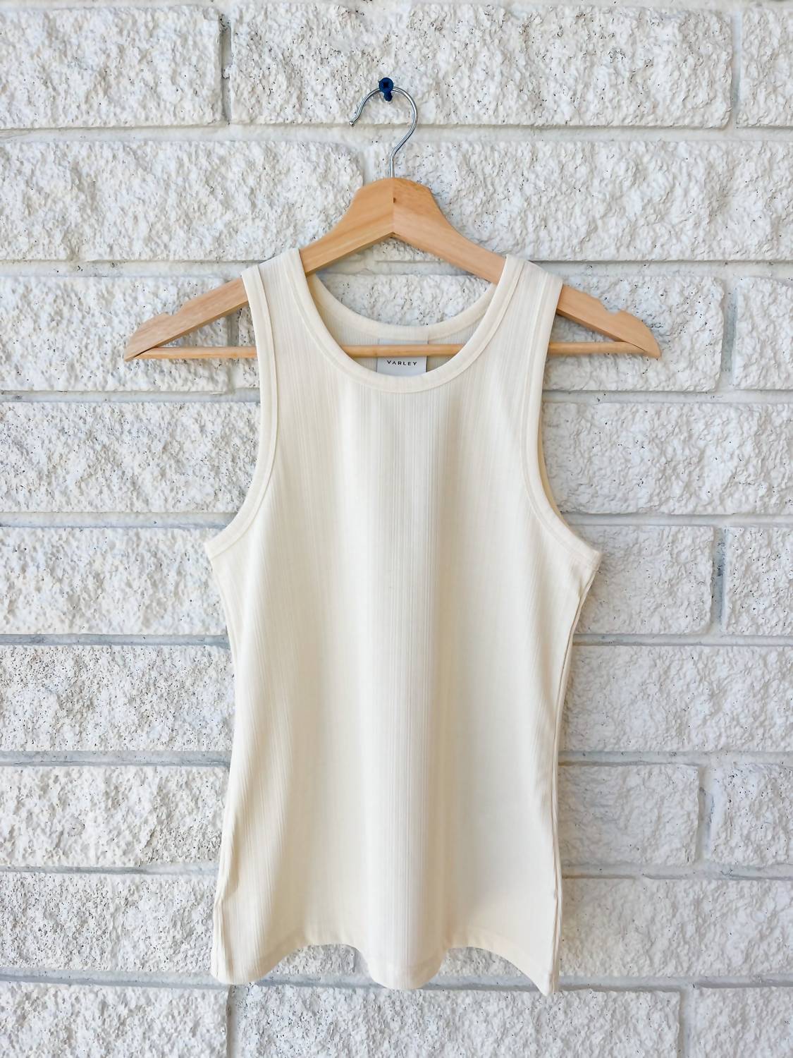 Fit, fabric and functionality. This tank top checks all the boxes. Discover the Thurman Tank Top by VARLEY, an essential piece for your vacation wardrobe in a chic Birch color. This sleeveless design features a scoop neck and wide binding for a flattering fit. Made from 68% Polyester, 28% Viscose, and 4% Elastane, this solid, fitted style is perfect for spring occasions. With a convenient pull-on closure, it promises comfort and ease for women on the go.