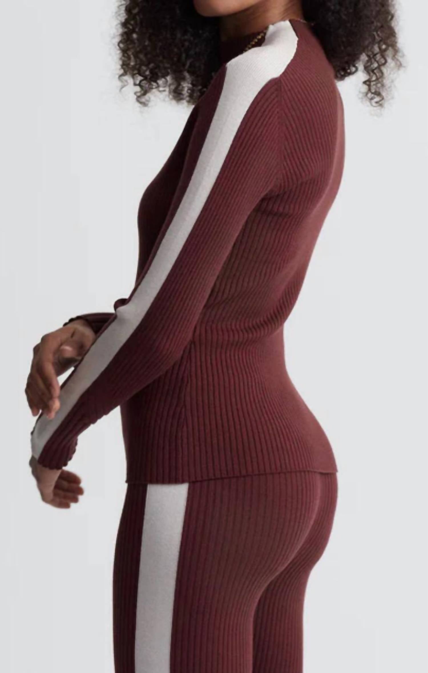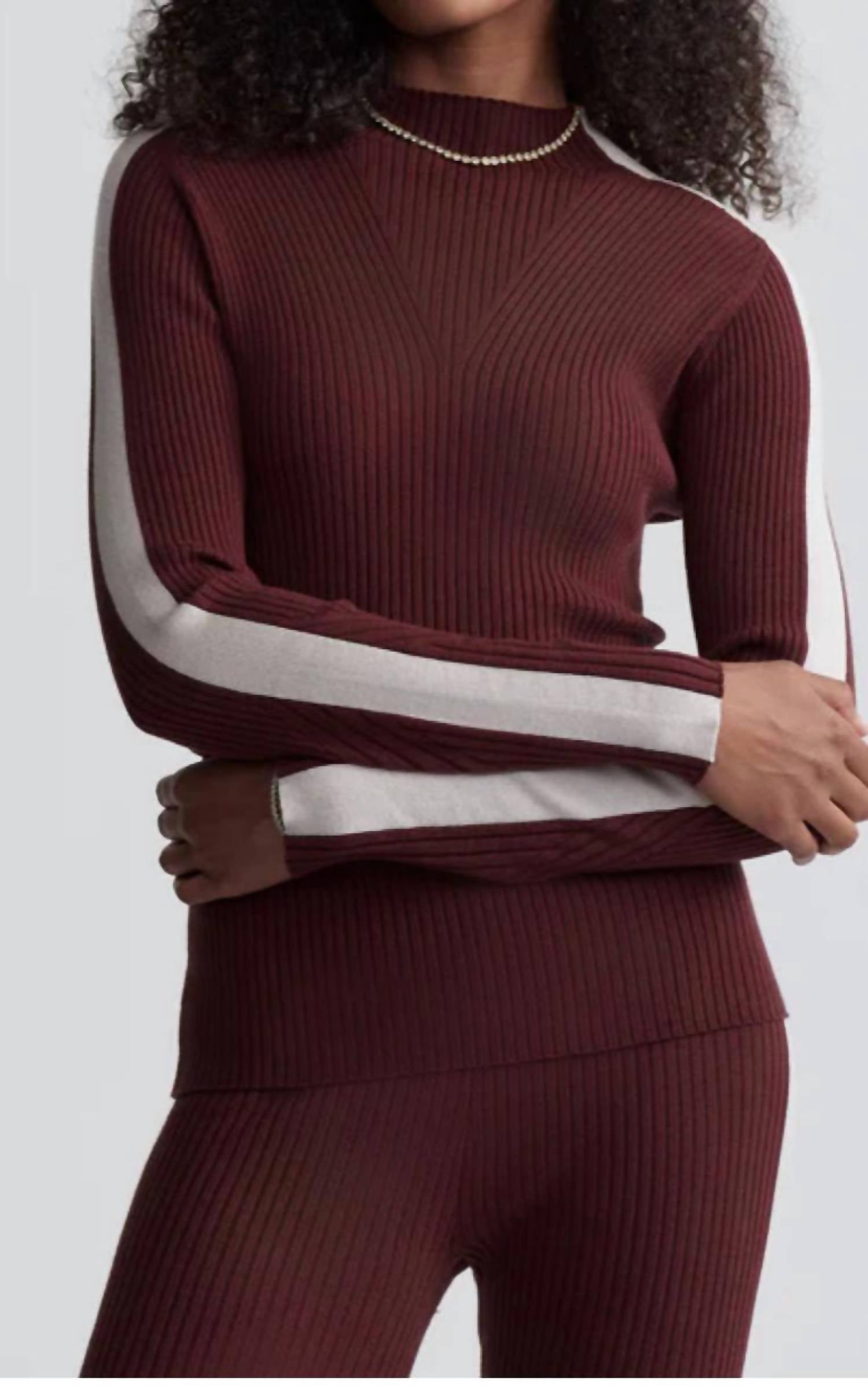 Layer under your favorite sweater or wear tucked into jeans for a perfectly polished winter look. Meet the Wilshire Mock Neck Knit by VARLEY, a chic addition to your winter wardrobe in a striking Red Chocolate hue. This women's knit features long sleeves and textured contrast panelling for a touch of refined style, perfect for après-ski layering. Designed with a mock neck, it offers a regular fit that complements the silhouette effortlessly. Made without pockets and with a convenient pull-on closure, it's a piece that balances elegance and functionality seamlessly.