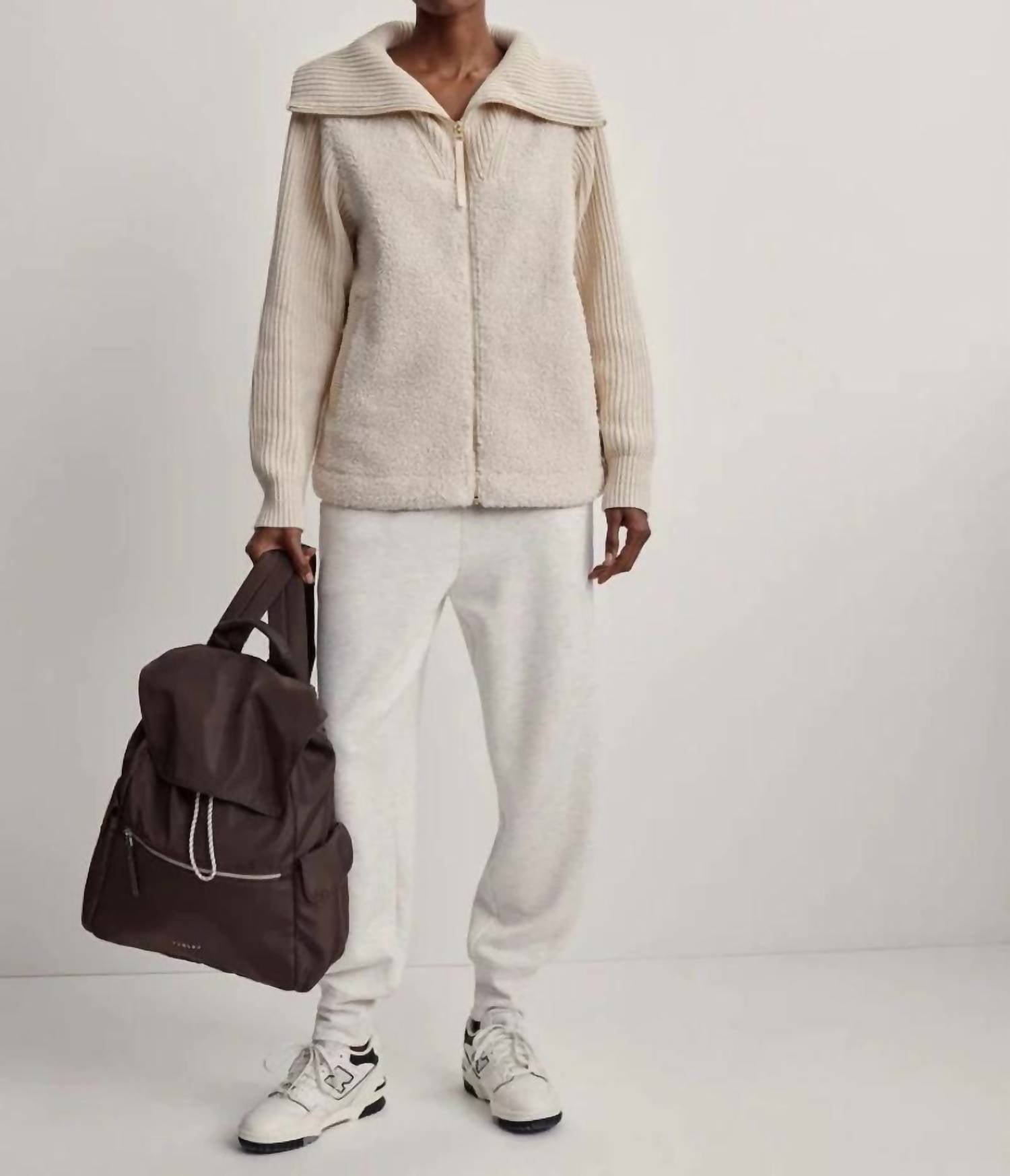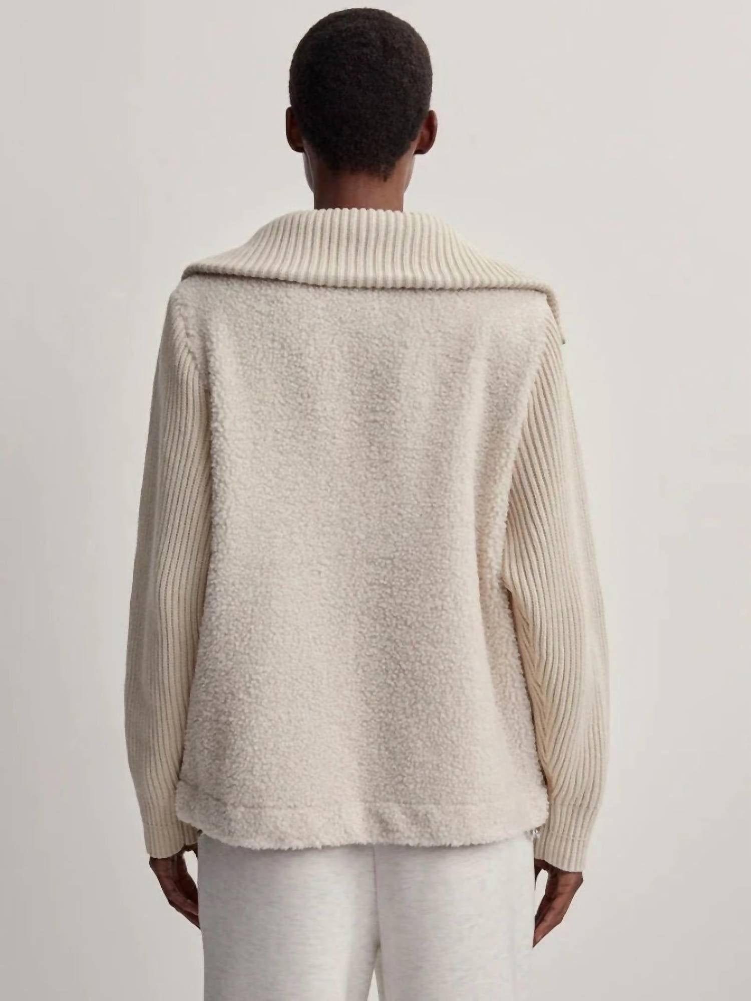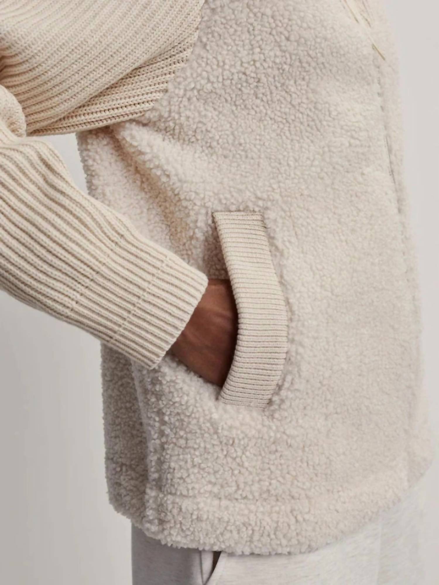 Cooler temps call for layering and we love this adorable sweatshirt for all the obvious reasons. A stylish zip-through designed to deliver elevated warmth and texture to your wardrobe. Ardley features a soft and warm boucle sherpa body, alongside an exaggerated rib knit collar and sleeves. Cut to an oversized fit, the combination jacket is complete with an internal cinch hem for customisable styling. Main: 100% Polyester. Contrast: 100% Cotton. True to size. Comfortabel fit.