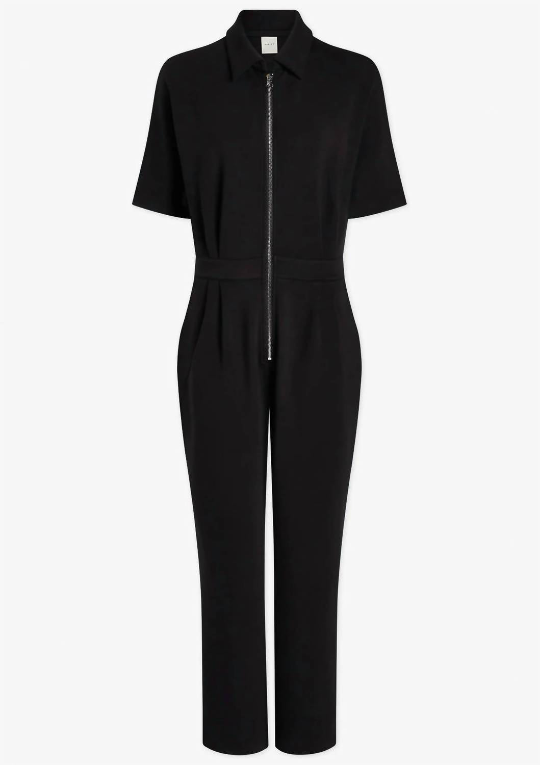 Introducing the Women's Corrine Jumpsuit by VARLEY, crafted for both comfort and style with short sleeves and a luxurious blend of 72% viscose, 23% polyester, and 5% elastane. This mid-weight jersey piece, made in China, features a pleated waist and a collared neck. It is designed with a convenient zip closure, slant hip pockets, and welt back pockets. For care, simply machine wash cold. Inseam measures 27.5 inches.