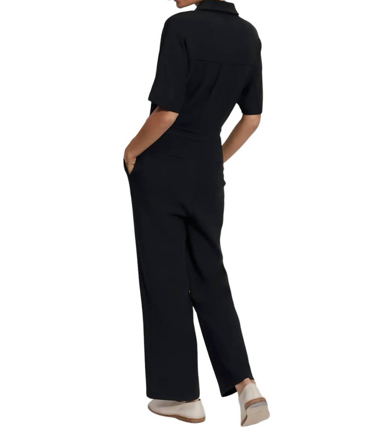 It doesn't take much for this one piece to look effortlessly cool. Add some statement jewelry to dress it up, or throw on some sneakers for a more casual vibe. Introducing the Women's Corrine Jumpsuit by VARLEY, crafted for both comfort and style with short sleeves and a luxurious blend of 72% viscose, 23% polyester, and 5% elastane. This mid-weight jersey piece, made in China, features a pleated waist and a collared neck. It is designed with a convenient zip closure, slant hip pockets, and welt back pockets. For care, simply machine wash cold. Inseam measures 27.5 inches.
