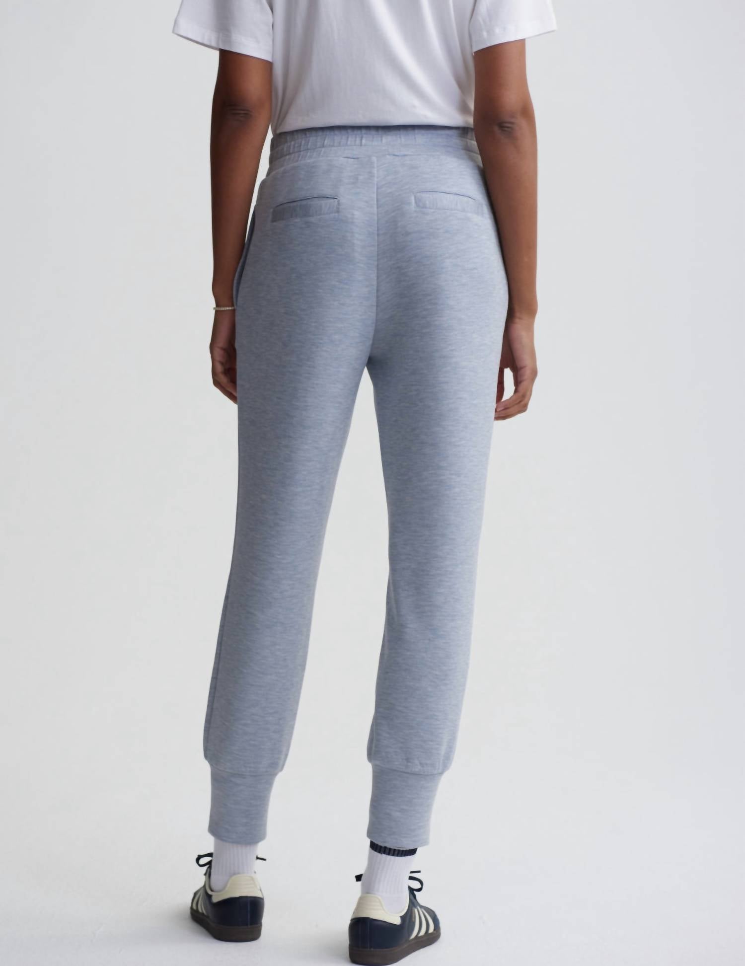 Introducing the Women's Slim Cuff Pant by VARLEY, a streetwear essential in Medium Blue Marl perfect for your vacation wardrobe. These pants feature a skinny leg style with a solid pattern, offering a sleek silhouette. The pull-on design provides ease and comfort, complemented by the convenience of pockets. Ideal for spring, these versatile pants are a chic addition to any outfit.