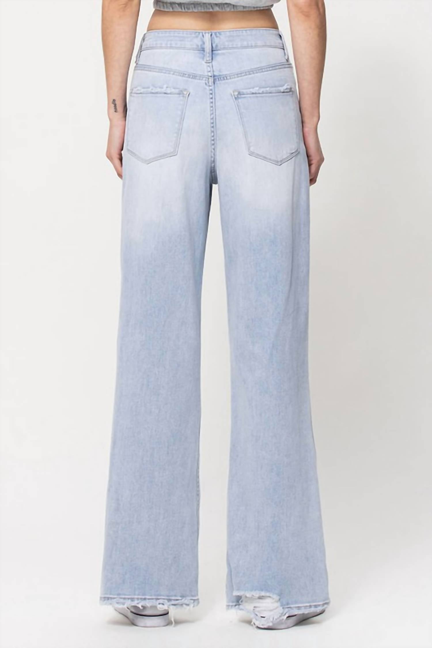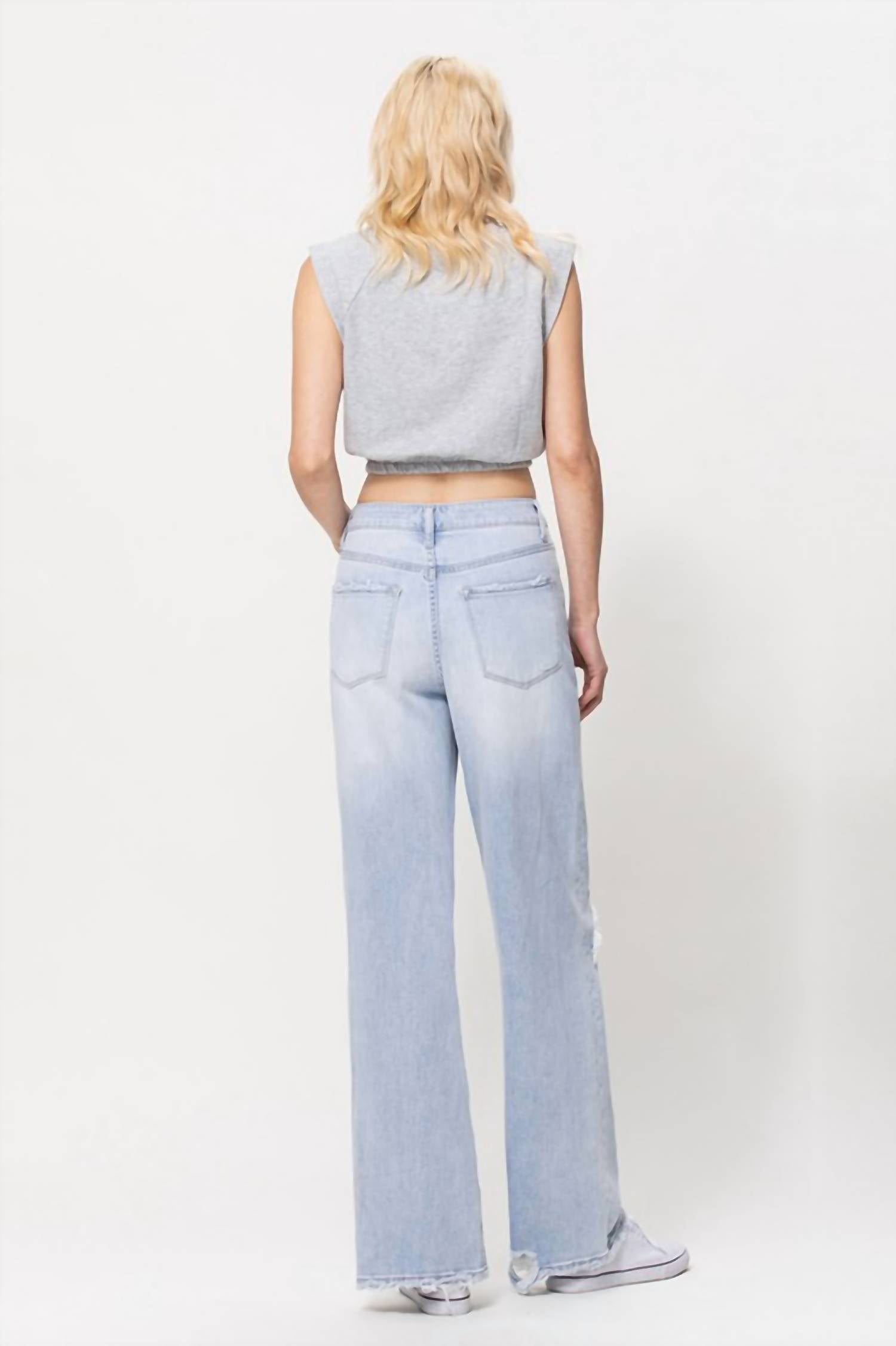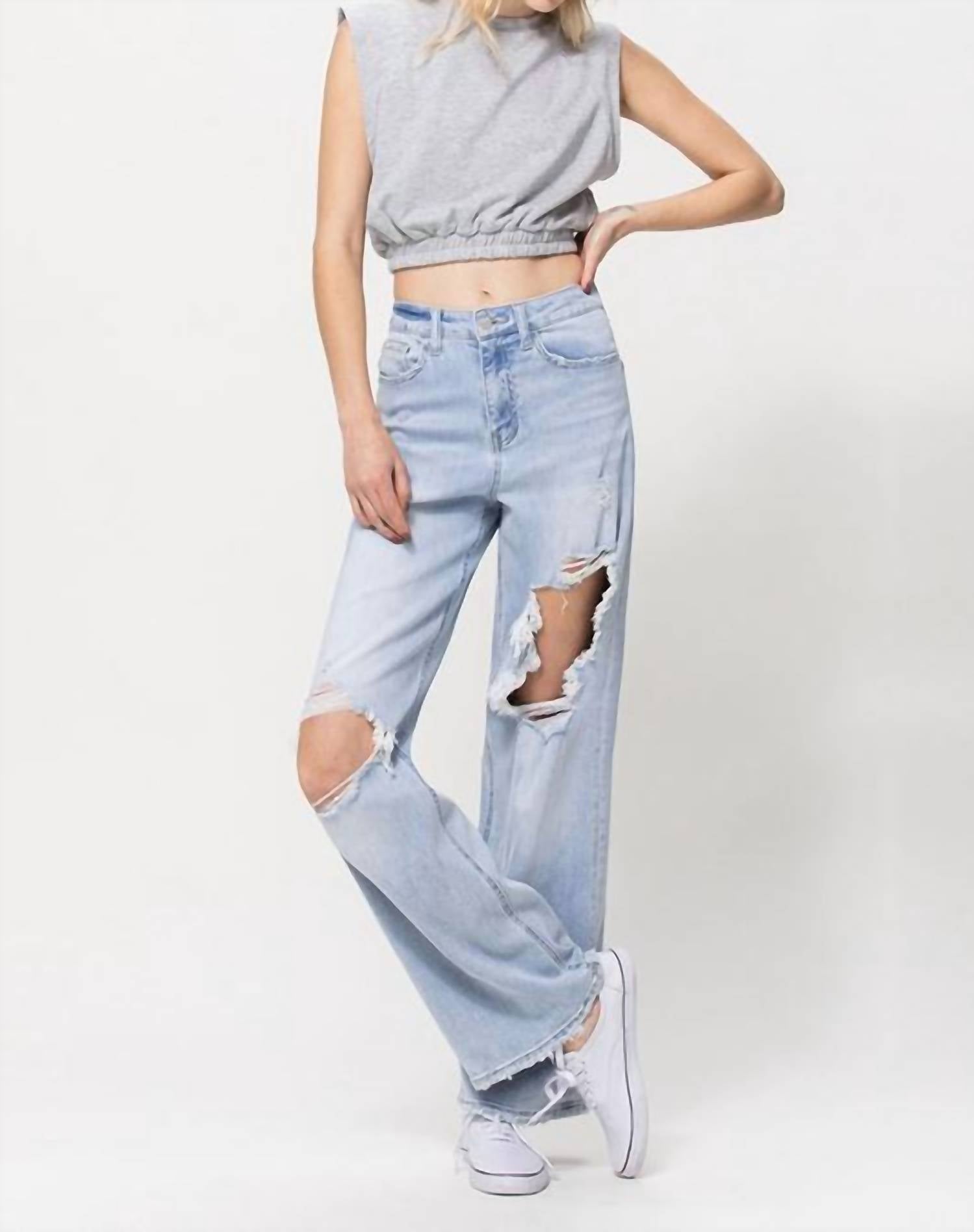 Just as cute as they are comfortable. Introducing the 90's Vintage Loose Distressed Jeans by VERVET BY FLYING MONKEY, a retro-inspired essential for your denim collection. These blue jeans feature a wide leg style with a distressed finish and a convenient button closure. Designed with practicality in mind, they come equipped with pockets for everyday use. Care instructions recommend a gentle hand wash followed by line drying.