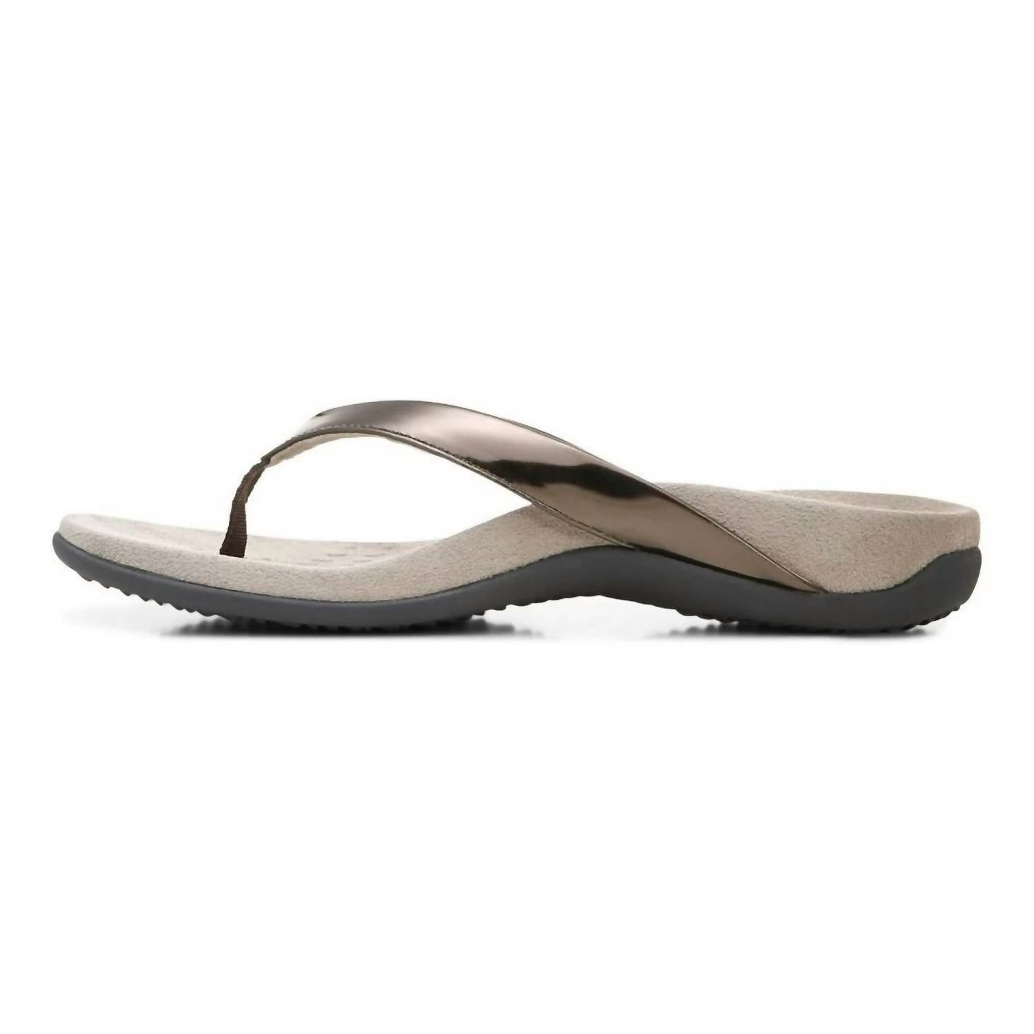 Experience beach days in comfort and style with the Women's Rest Dillon Flip Flops by Vionic, featuring premium leather straps and a metallic hue for a preppy summer look. Designed with an almond toe and Vionic's signature contoured footbed, these slippers provide all-day support with a biomechanical orthotic that helps relieve heel pain. The lightweight EVA midsole absorbs shock, reducing stress on feet, and the durable rubber outsole offers reliable traction. Seamlessly merging style and function, these flat-heeled flip flops are a perfect blend for a Thanksgiving beach day or any sunny occasion.