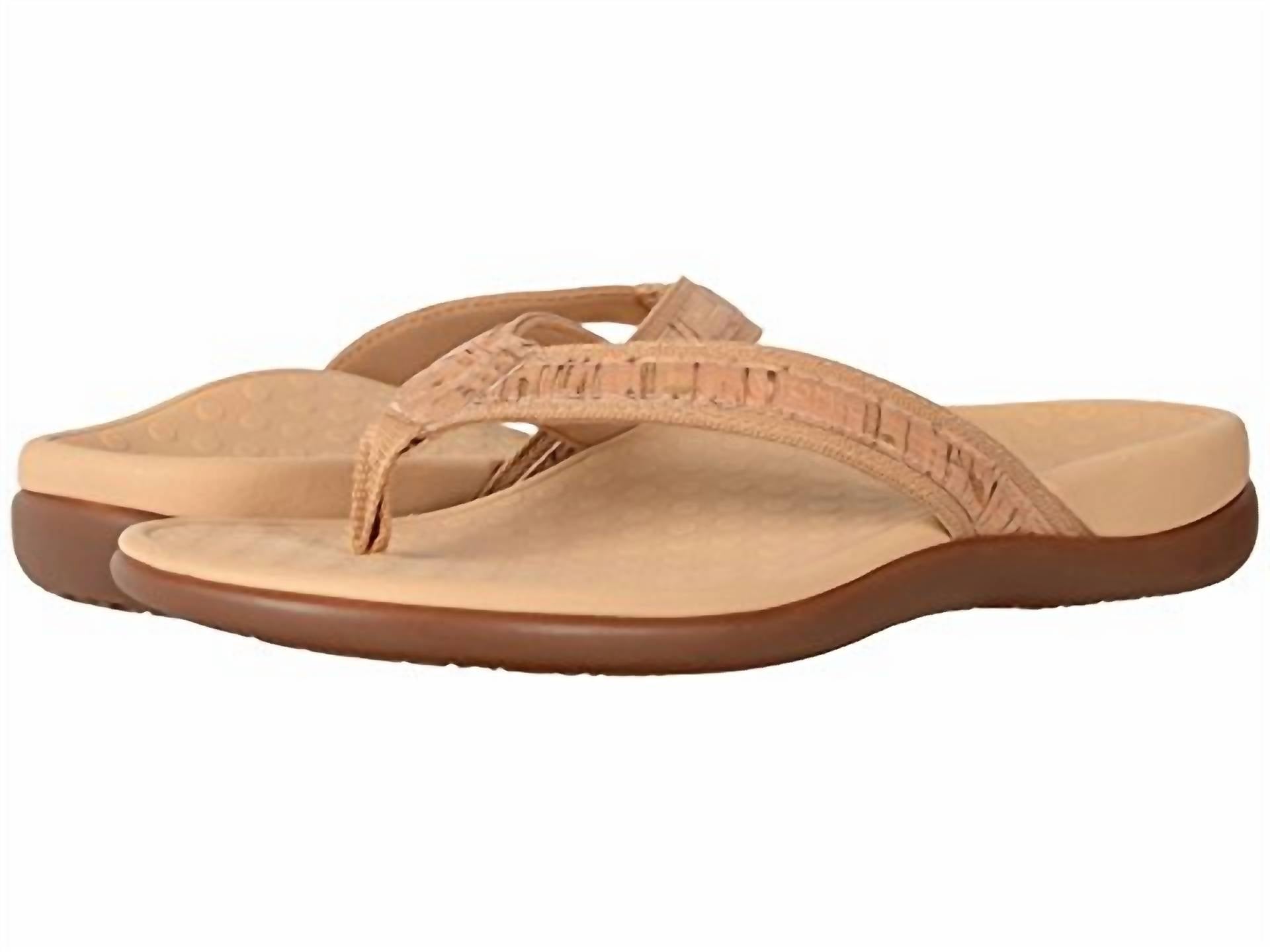 Classicly cute and all-day-wearable. We love this sandal. Meet the Women's Tide II Toe Post Sandal by VIONIC, a perfect blend of quality and comfort in a chic Gold Cork hue. Designed with a woven polyurethane upper accentuated by stylish leather trim, this sandal ensures a secure fit with its soft woven toe post and foam-lined strap. Its lightweight, flexible medium-density EVA midsole is designed to absorb shock, reducing stress on your feet, ankles, and knees, while the durable TPR outsole features a wave-patterned tread for optimal traction. Imported and flat with a heel height of under 1 inch, it weighs just 6 oz, making it ideal for all-day wear.