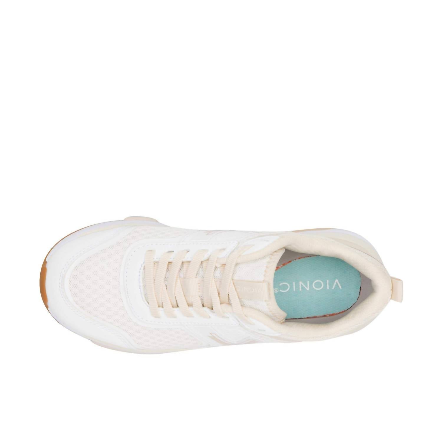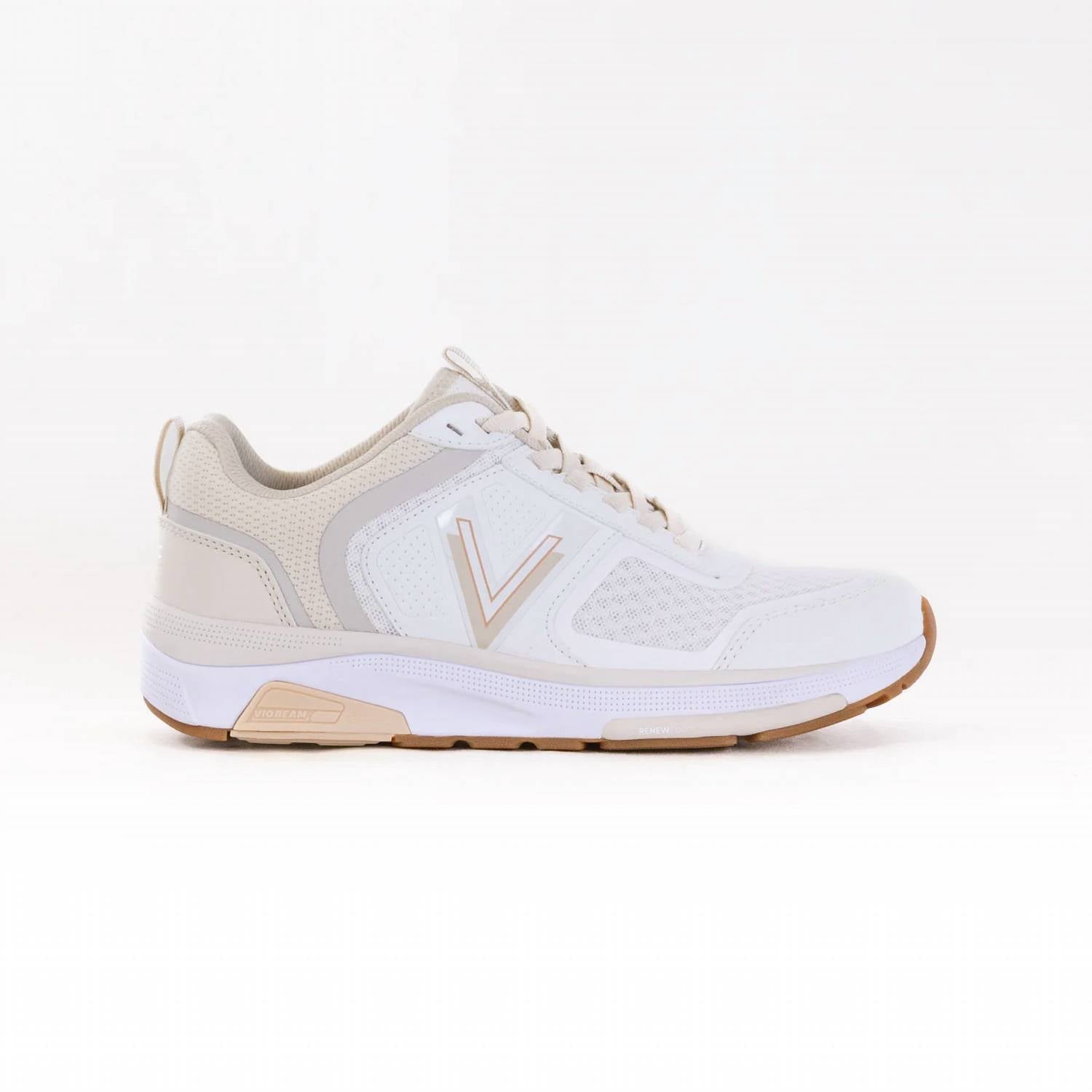 Step into comfort with the Women's Walk Strider Sneaker by VIONIC, crafted with a seamless blend of style and support. This sneaker features a mesh fabric upper with synthetic or suede trim, complemented by a removable mesh-covered EVA footbed for a personalized fit. Its durable rubber outsole boasts First Ray Technology and Vio Flex insole for superior stability and moisture control, making it perfect for all-day wear. With a heel height of 1.75 inches and a platform height of 1.125 inches, this white/cream sneaker provides the ideal balance for a natural walking stride.