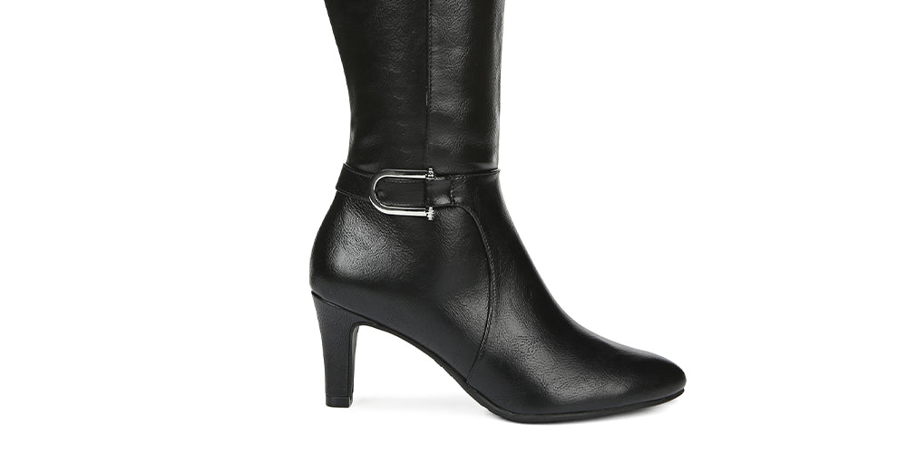 Amp up your cold-weather style in the chic and stunning Galina wide calf dress boot from LifeStride. Water-resistant faux leather upper with a softly pointed toe| side zip| hidden stretch for extra flexibility| and metallic buckle detail. Soft System® comfort package provides all-day support| flex| and cushioning. Traction sole provides you with extra stability. Just Right Height 2 and 3/4 inch heel.| 2.76 heel