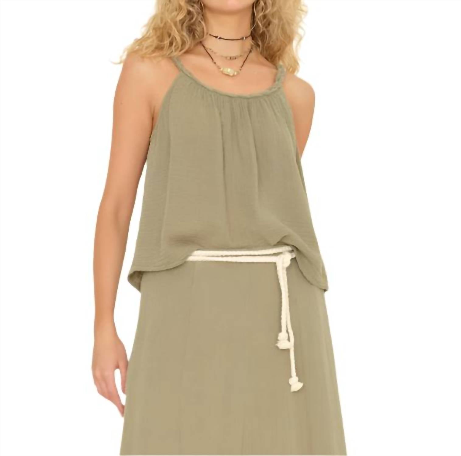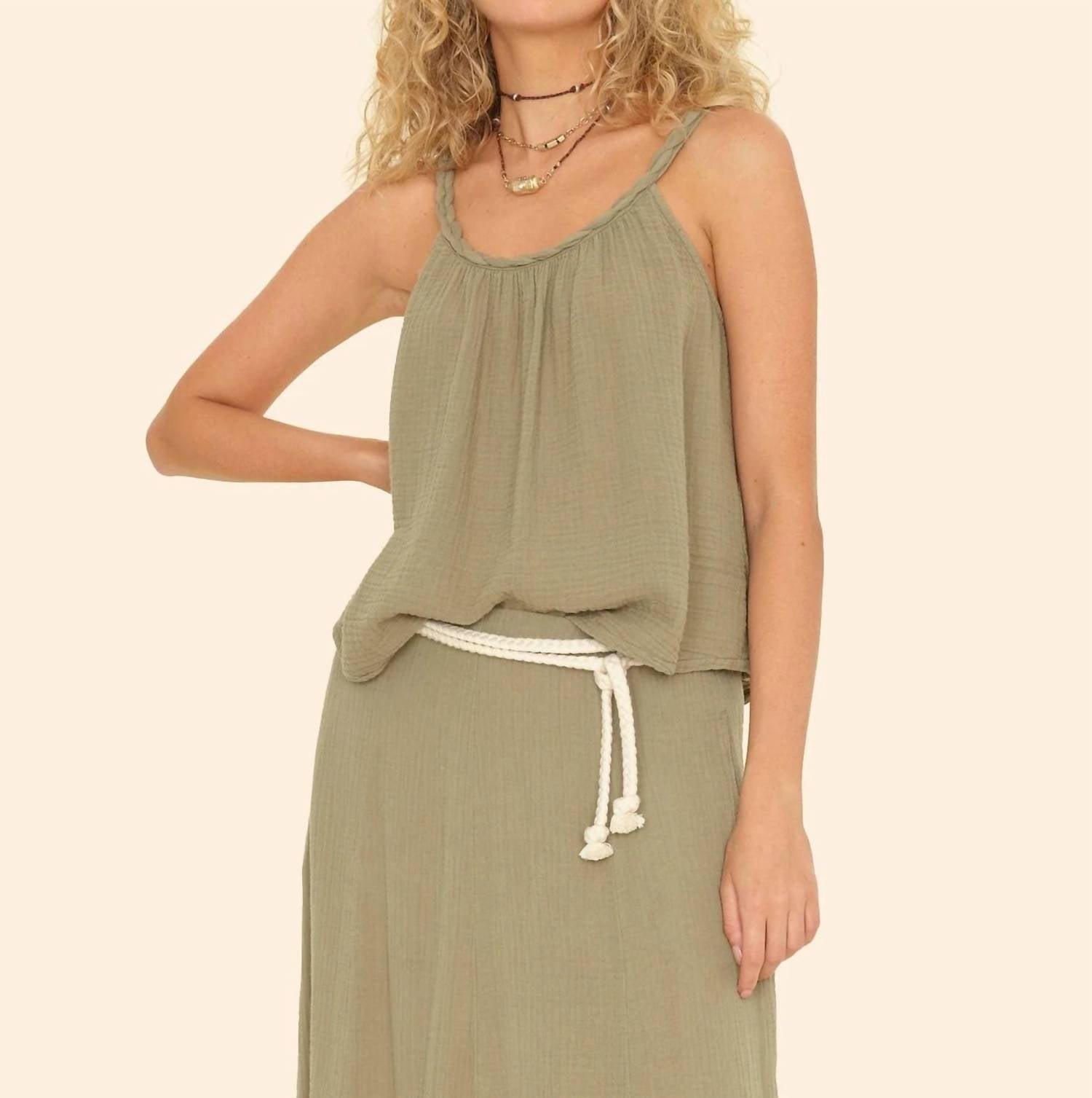 This classic tank top is perfect for layering and cute enough to wear on its own. Introducing the Brandi Tank by XIRENA, crafted from 100% cotton for a soft, gently crinkled feel in the alluring Dark Sea Grass hue. This sleeveless, flowy tank top features a twisted braid neck and straps, enhancing its unique design. Made in the USA, it offers effortless style with a pull-on closure for easy wear.
