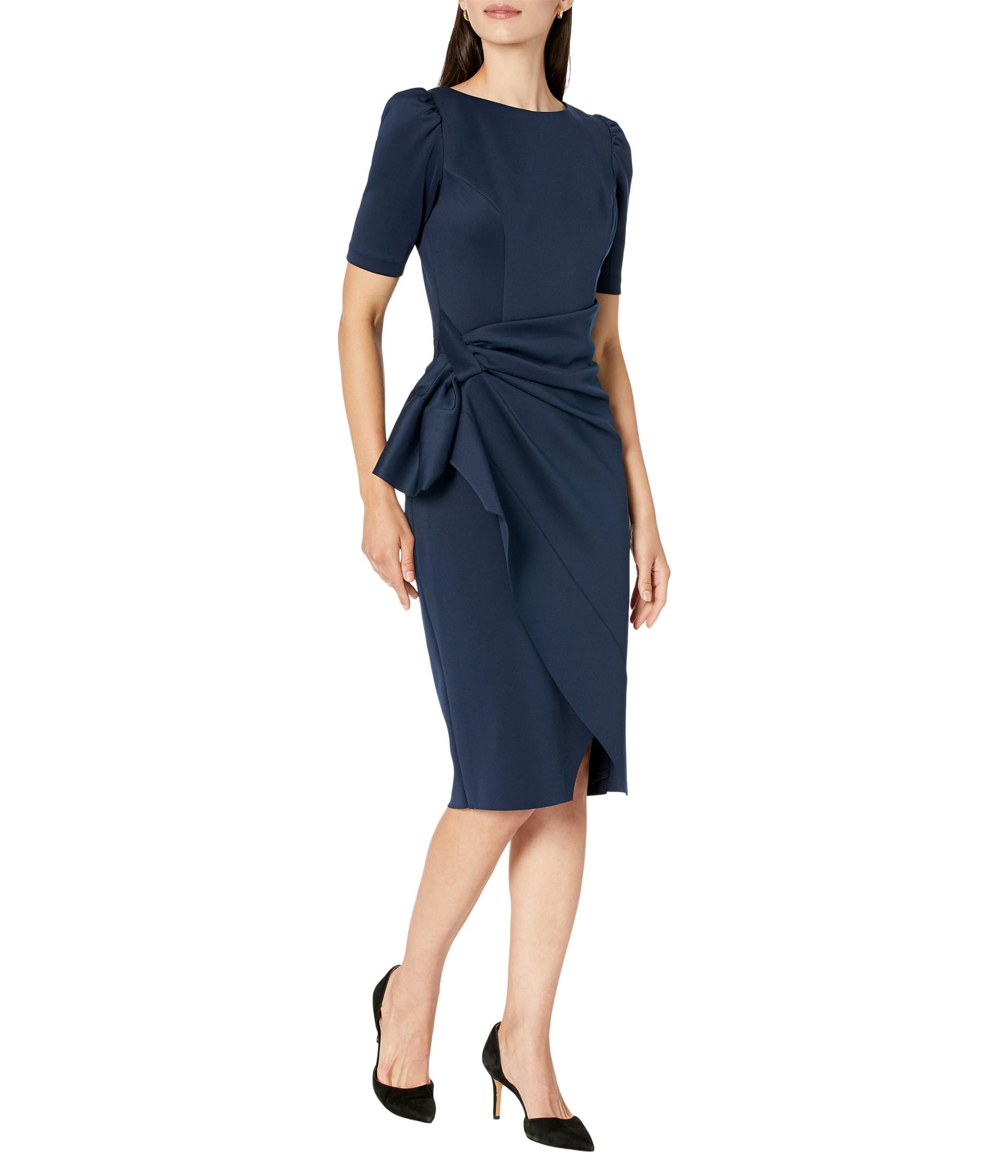 A structured midi dress in scuba knit with three-quarter sleeves. The smooth, slightly stretchy fabric creates a tailored, body-skimming silhouette that holds its shape while allowing comfortable movement. The deep midnight hue provides a polished, versatile look suitable for evening events, cocktail parties, or refined daytime occasions.