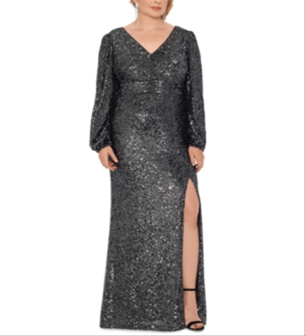 XSCAPE Women's Long Sleeve V Neck Full Length Evening Sheath Dress Black Size 14W
