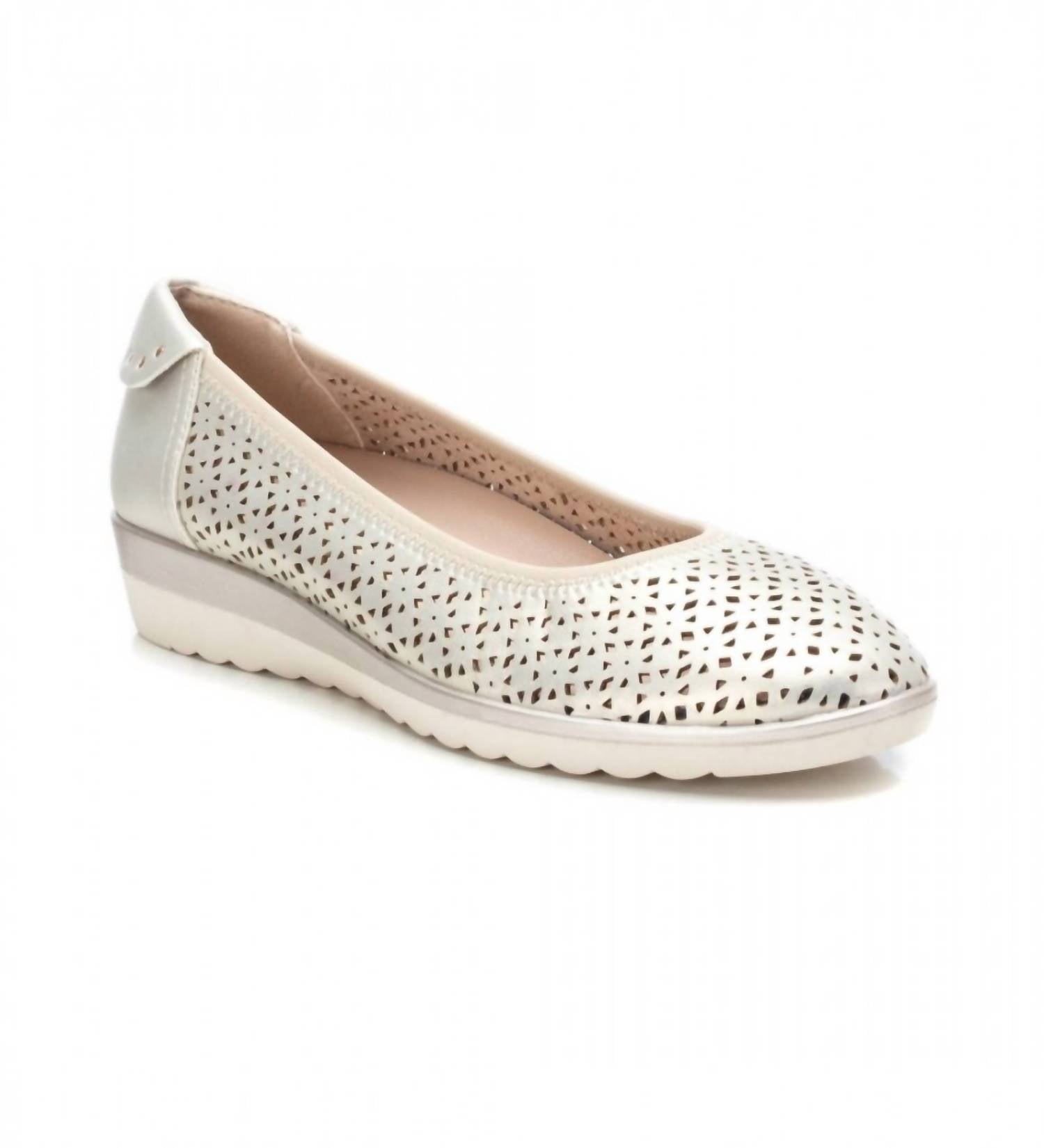 A classic loafer that is both comfortable and polished.Made of material that imitates leather with a die-cut motif. Detail of studs on the back and metallic band on the sole. Non-slip rubber sole.