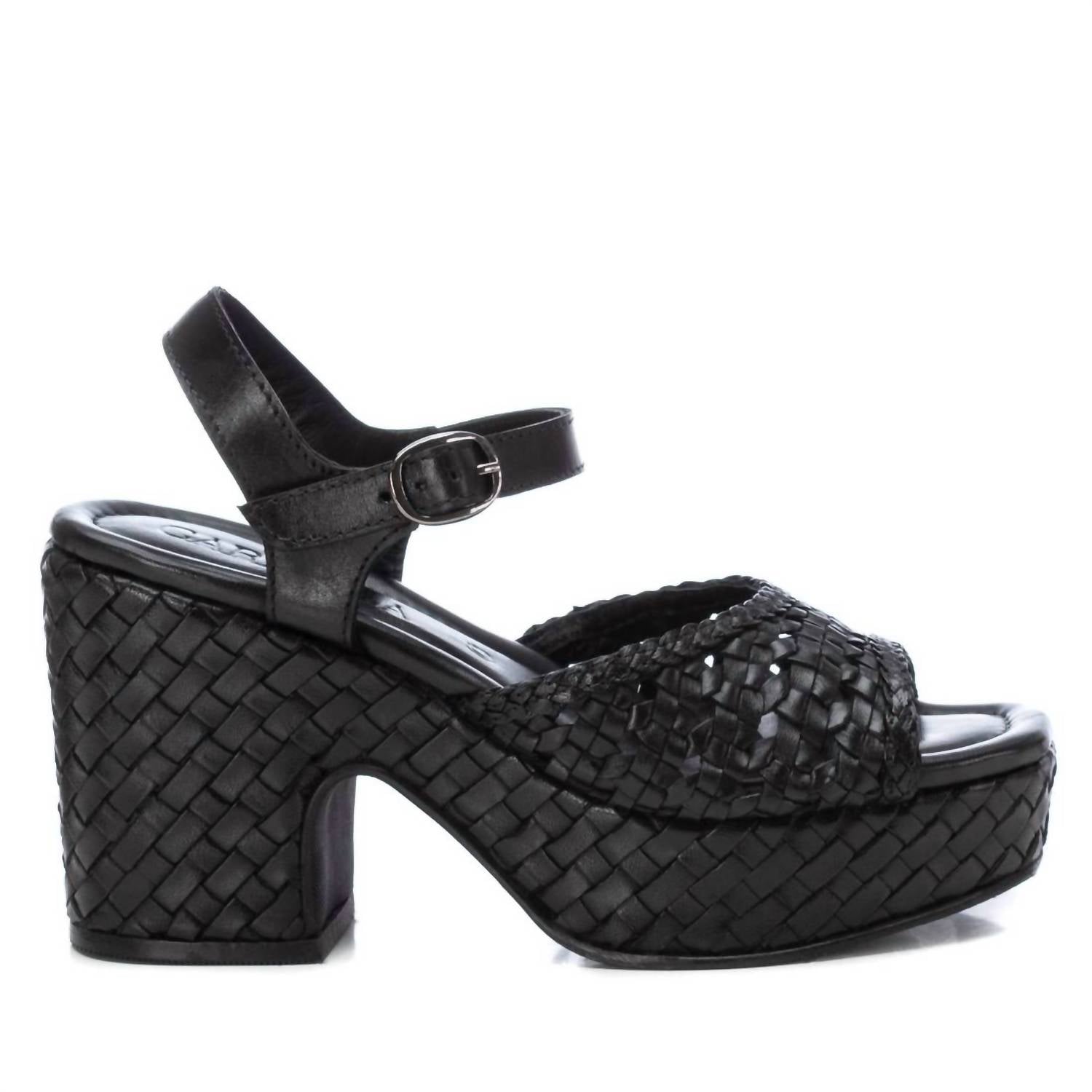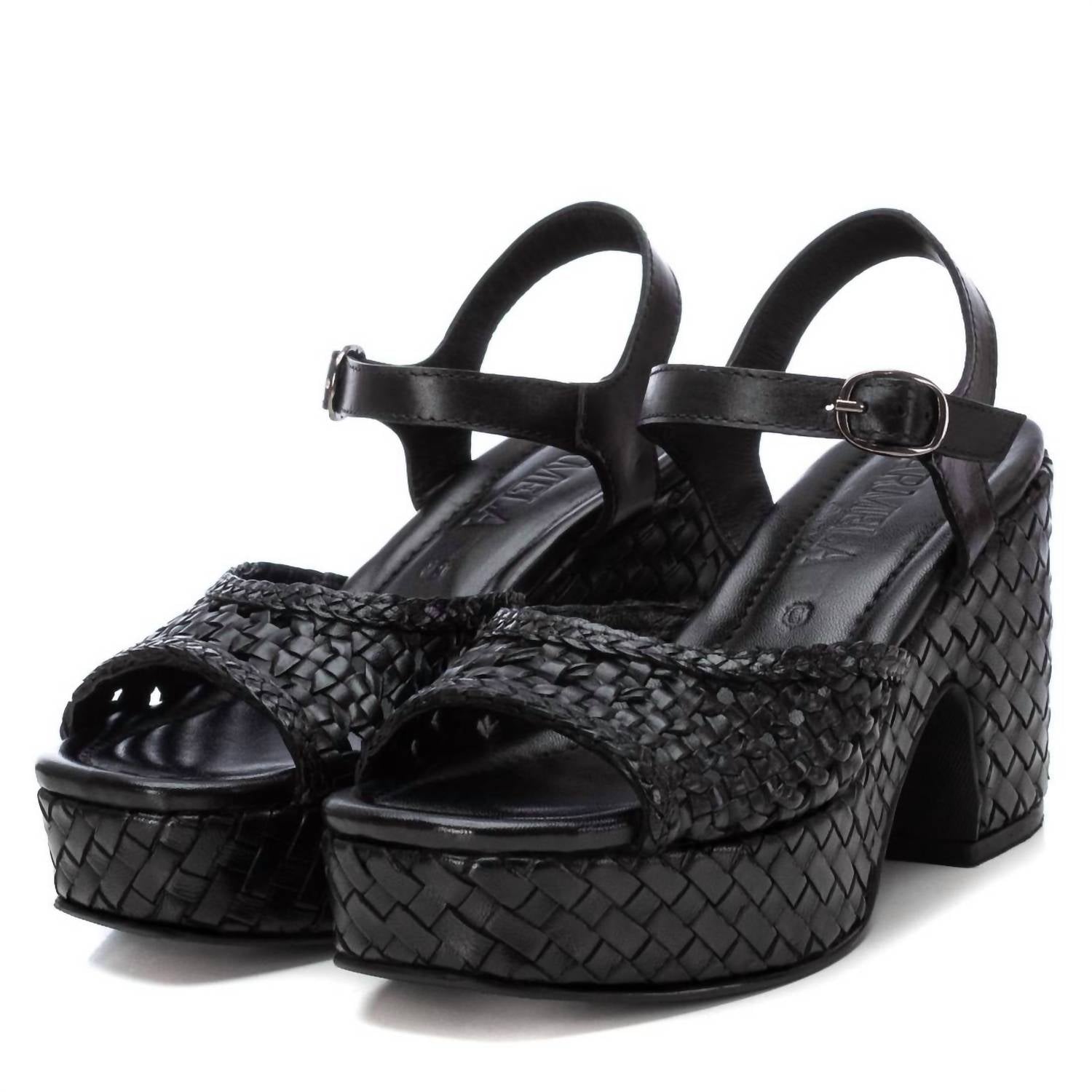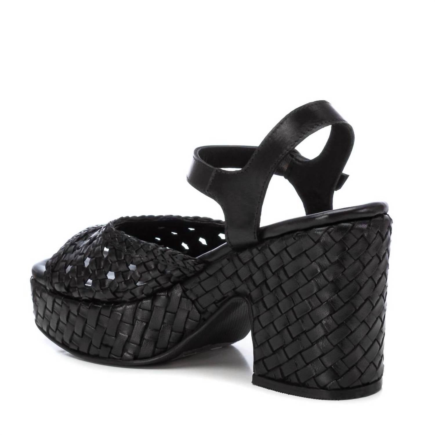 Classicly cute and all-day-wearable. We love this sandal. Elevate your wardrobe with the Women's Carmela Leather Heel Sandals by Xti, a sophisticated addition to any outfit. Crafted in sleek black, these sandals feature an open toe design and a high, chunky heel measuring 3.94 inches for a chic and trendy look. Ideal for work or a night out, they combine style and comfort effortlessly. Perfect for adult women seeking a fashionable touch to their ensemble.