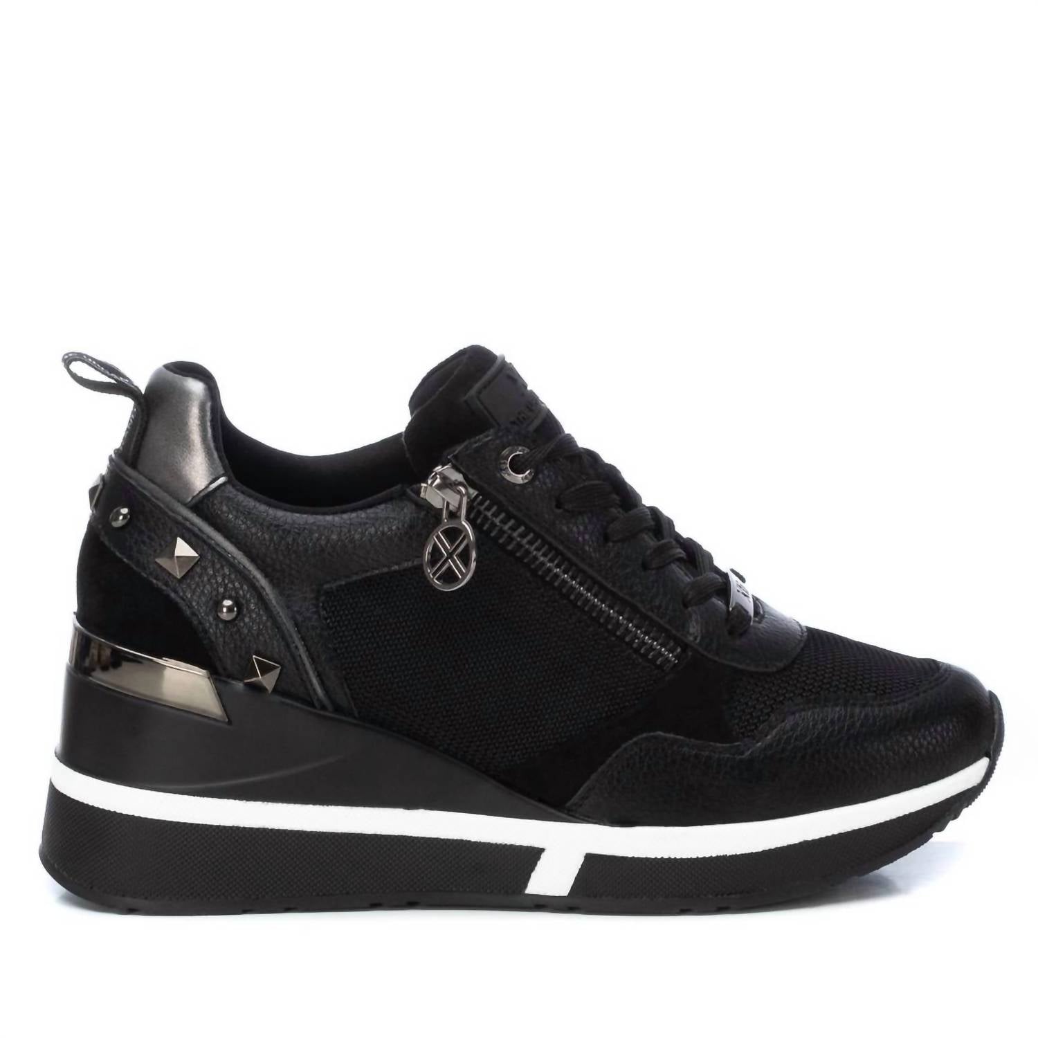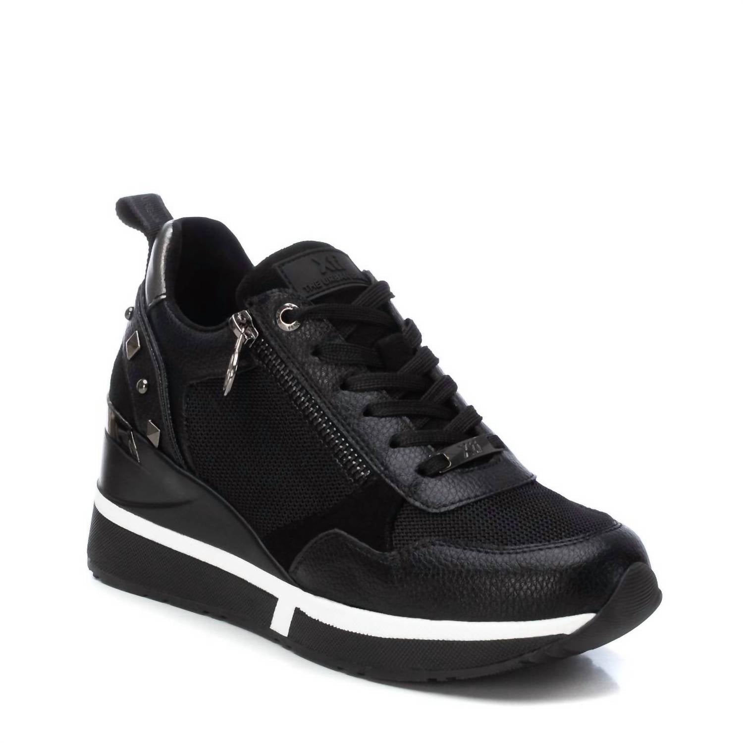 When fashion and function come together seamlessly. Step up your style with the Women's Casual Wedge Sneakers from Xti, crafted from breathable textile material and tone-on-tone mesh in sleek hue. These sneakers boast a comfortable 2.36-inch wedge heel with a non-slip rubber sole, perfect for adding height without sacrificing comfort. Featuring a round toe design, laces, and a convenient side zip closure, these trainers ensure a custom fit. Certified vegan by PETA, they also include a removable padded insole for added ease and versatility. Ideal for women looking for a blend of casual style and comfort.