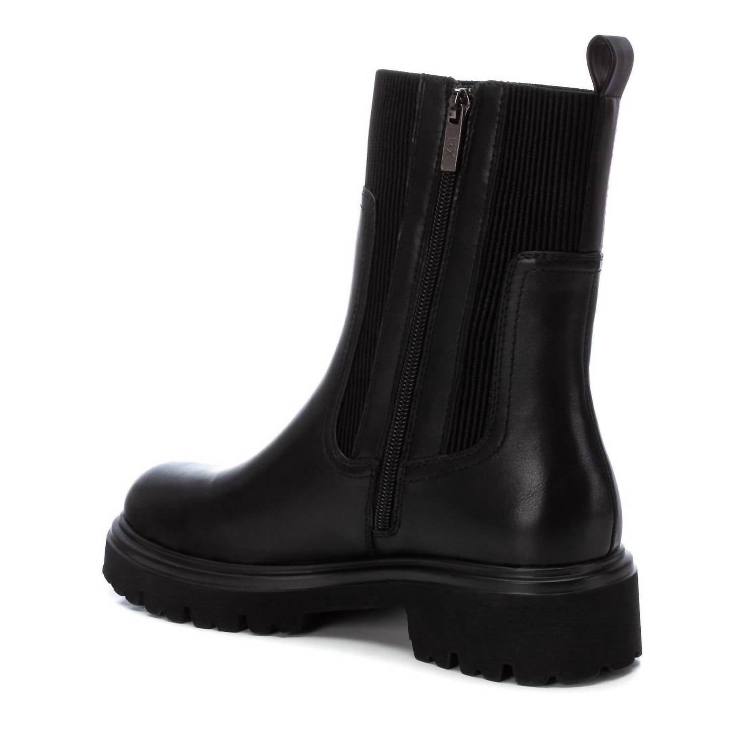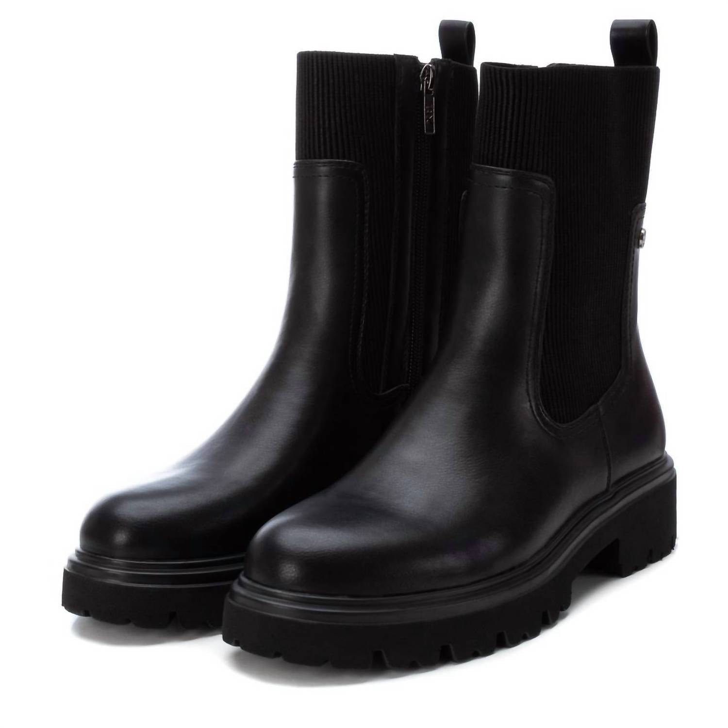Say hello to the perfect, most versatile boot. The ankle height makes this style easily transition from day to night. Wear them with your favorite skinny jeans and tee for a more laid back look, or pair them with your favorite mini dress and jacket for a night out on the town. Elevate your wardrobe with the Women's Chelsea Booties by Xti, crafted from high-quality faux leather in classic black. Featuring a 1.57-inch block heel, these booties combine casual comfort with an elegant design, perfect for any outfit. They have a side zipper closure, a soft elastic side band, and a rear puller for easy fitting. Ideal for all-day wear, these boots are made with a breathable padded insole and a non-slip lug rubber sole, certified vegan by PETA.
