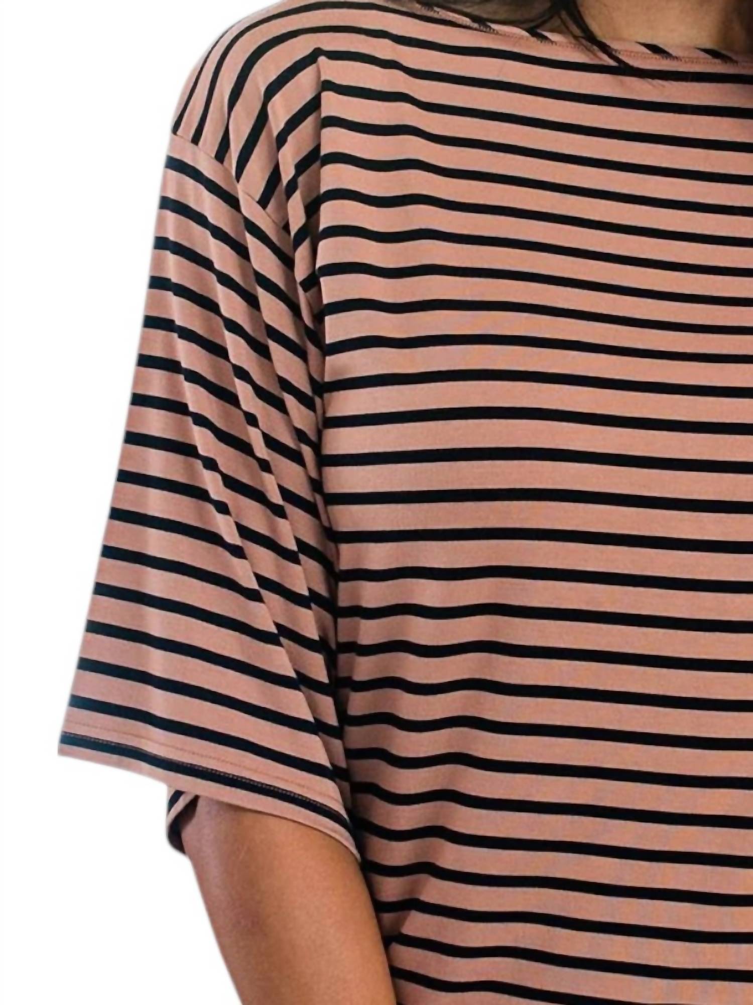 A timeless blouse that will never go out of style. Embrace the allure of the French Riviera with the Jaclyn Wide Sleeve Boatneck Bamboo Top by Yala, available in a striking Black Newport Stripe. This blouse features three-quarter kimono-inspired sleeves and is crafted from a viscose blend for exceptional softness and stretch, ensuring a comfortable fit. With a pull-on closure and boatneck design, the top sits loosely at mid-hip, perfect for both work and play. Care instructions: Machine wash and tumble dry.